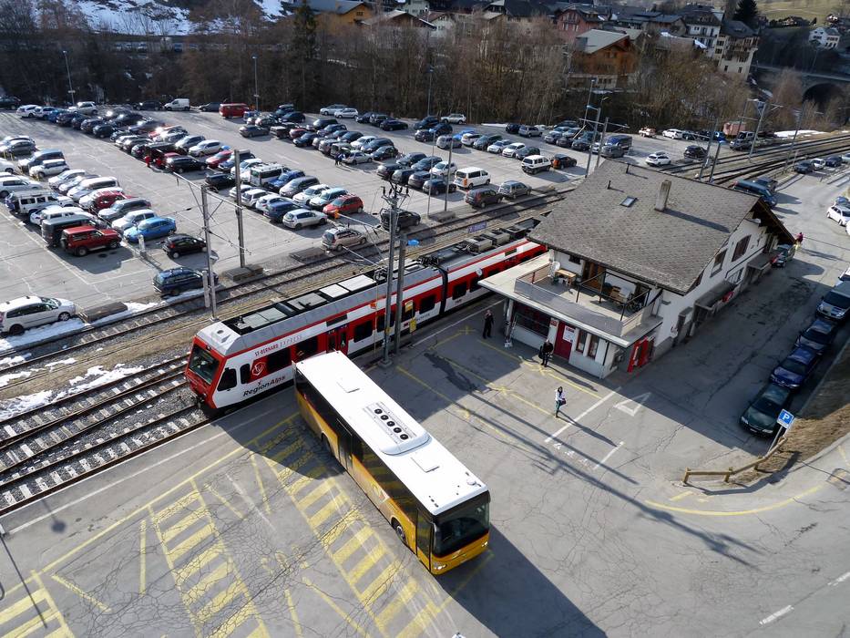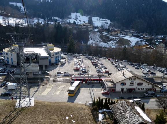 Tegenover het station Le Châble vertrekt direct de gondelbaan Le Châble naar het skigebied. - skibussen