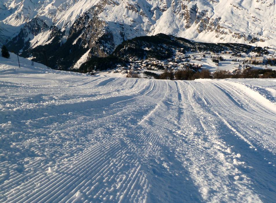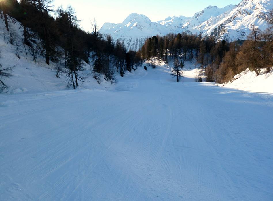 Het panorama op de granieten bergen van Bergell aan de ene kant en het besneeuwde merenlandschap van het Oberengadin aan de andere kant is zo mooi dat je tussen de afdalingen in het wintersportgebied Aela graag even pauzeert om van het uitzicht te genieten. Het skigebied Aela, niet ver van de grote