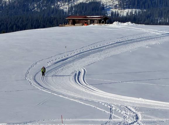 De loipe loopt vanaf het bergstation van de Almbahn II over de Loferer Alm.