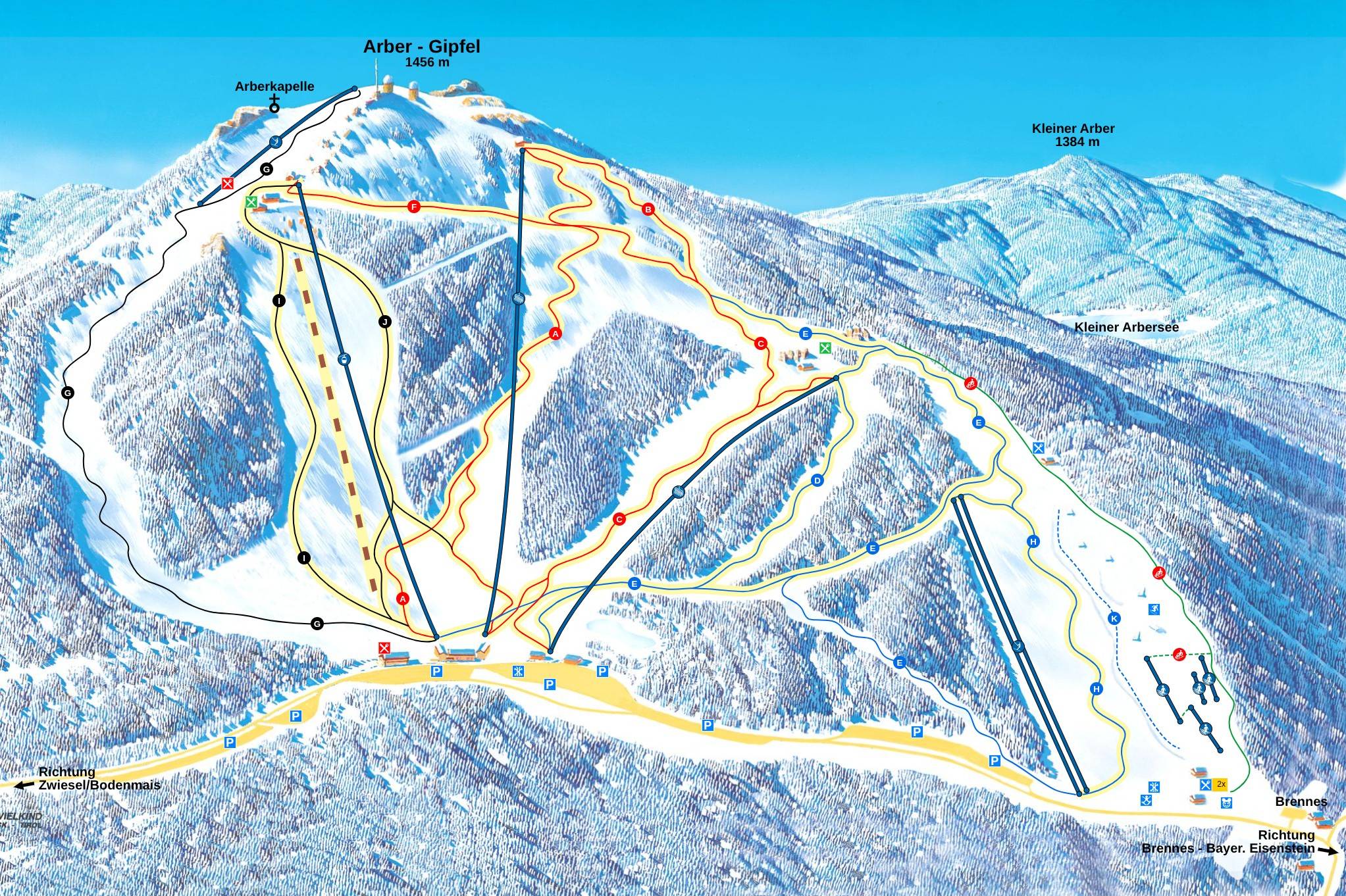 Oriëntatie (pistekaart, informatieborden, bewegwijzering piste) en veiligheid in het skigebied Arber Pistekaarten en overzichtskaarten