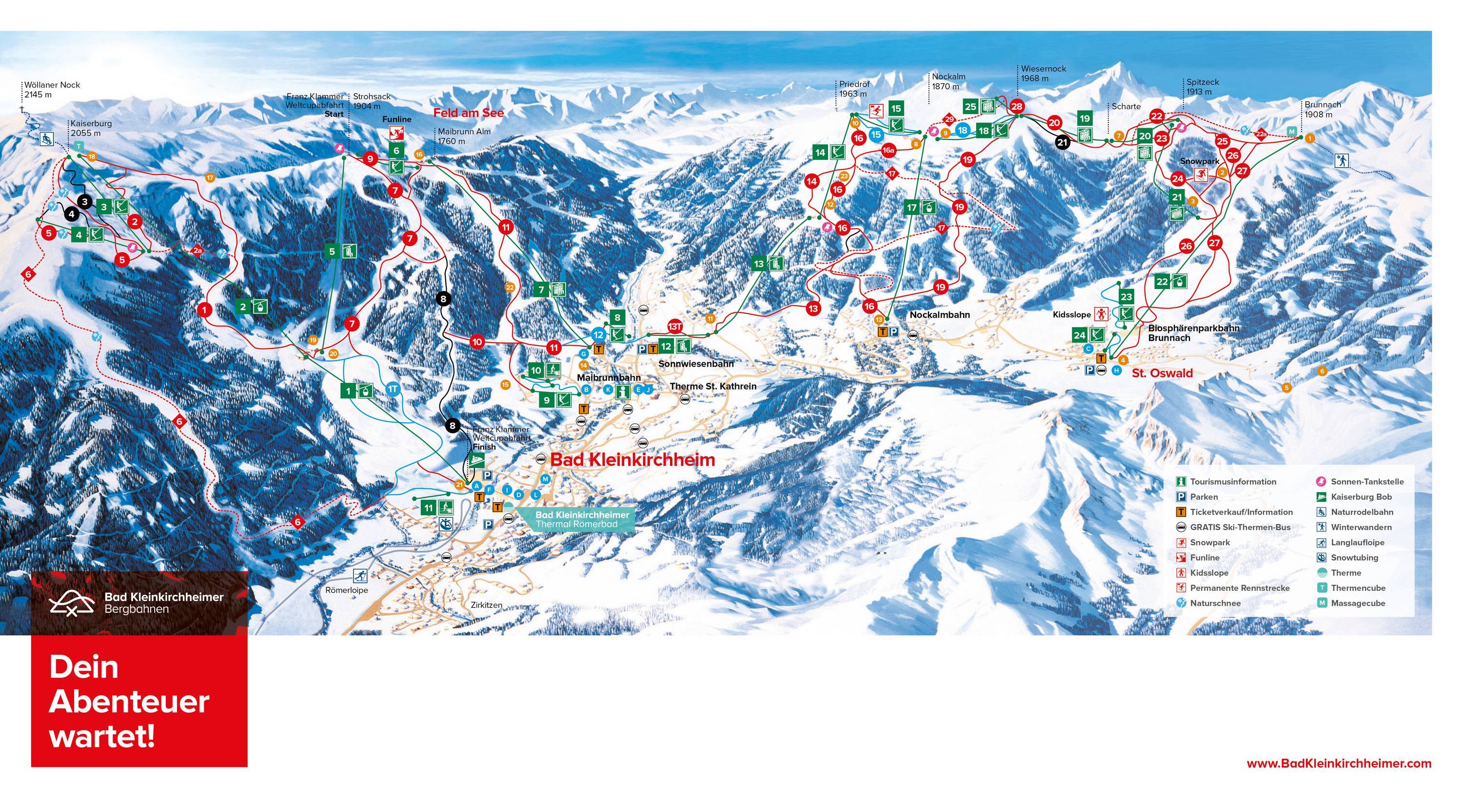 Het pisteplan geeft het hele gebied van Bad Kleinkirchheim tot St. Oswald zeer goed weer. Alle liften en pistes zijn nauwkeurig beschreven. Op de achterkant vind je informatie voor de zomervakantie.