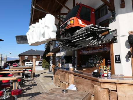 Boven de après-ski-bar prijkt een afgedankte pistebully.
