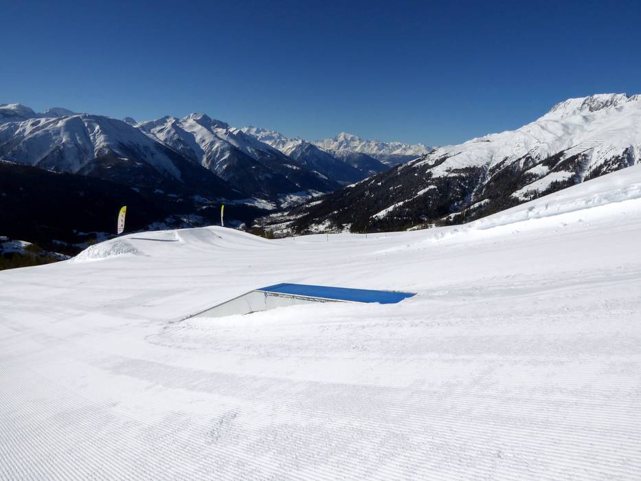 Het skigebied Bellwald biedt een mooi snowpark met een prachtig panorama.