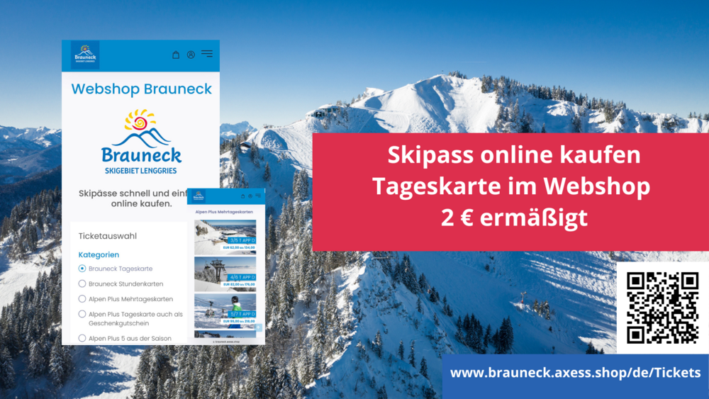 In de webshop kunt u een reeds bestaande Alpen Plus chipkaart opladen of een voucher kopen die bij de kassa’s van het skigebied of bij de ticketautomaat in het skigebied kan worden ingewisseld voor een skipas. Ticketautomaten bevinden zich bij de dalstations van de Brauneck-Bergbahn.brauneck.axess.shop/de/Tickets