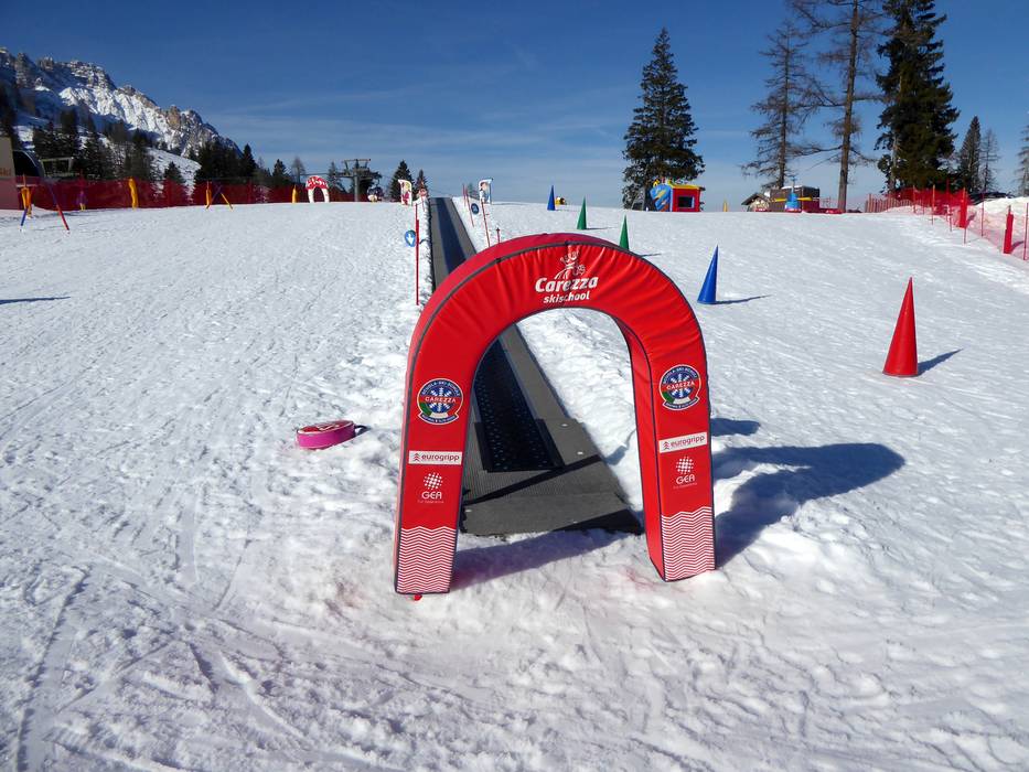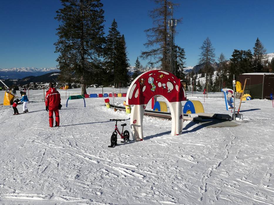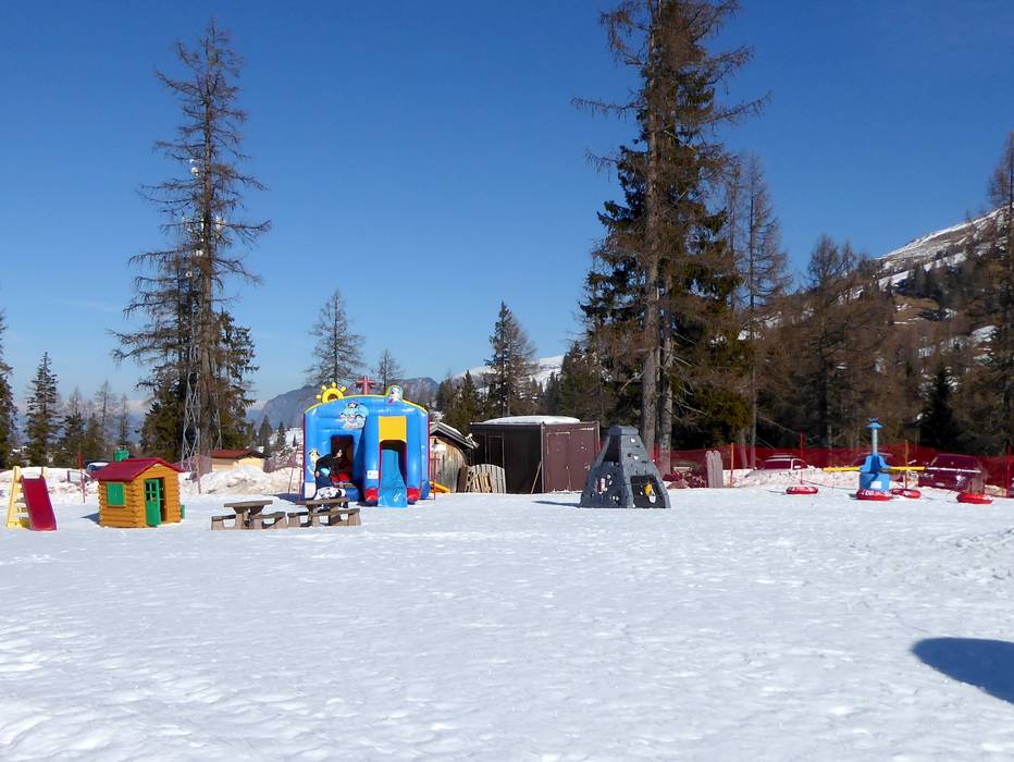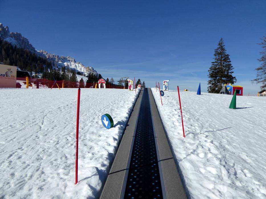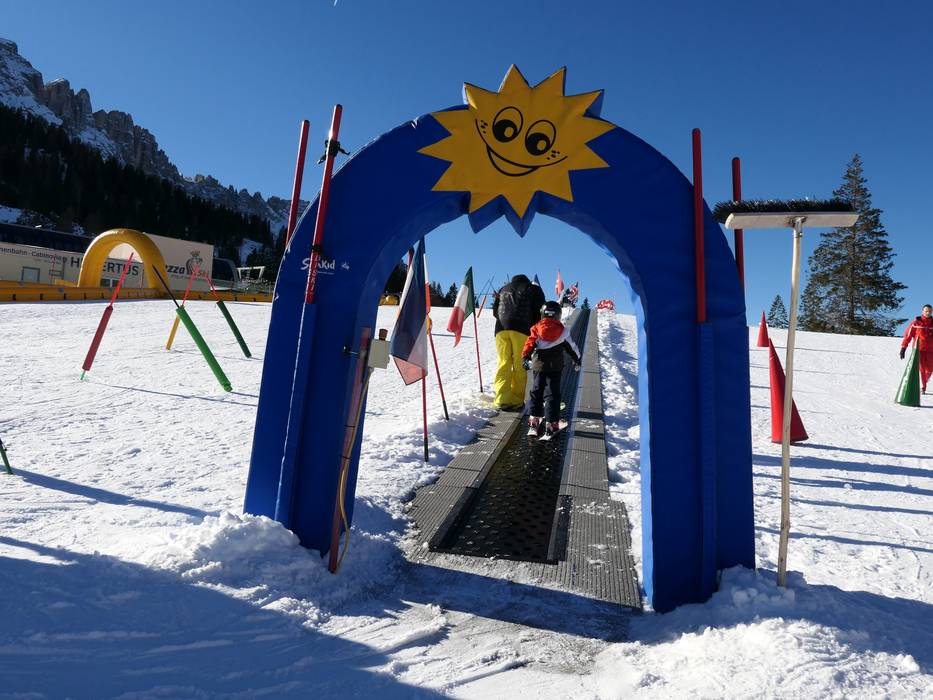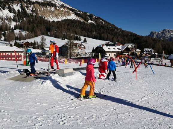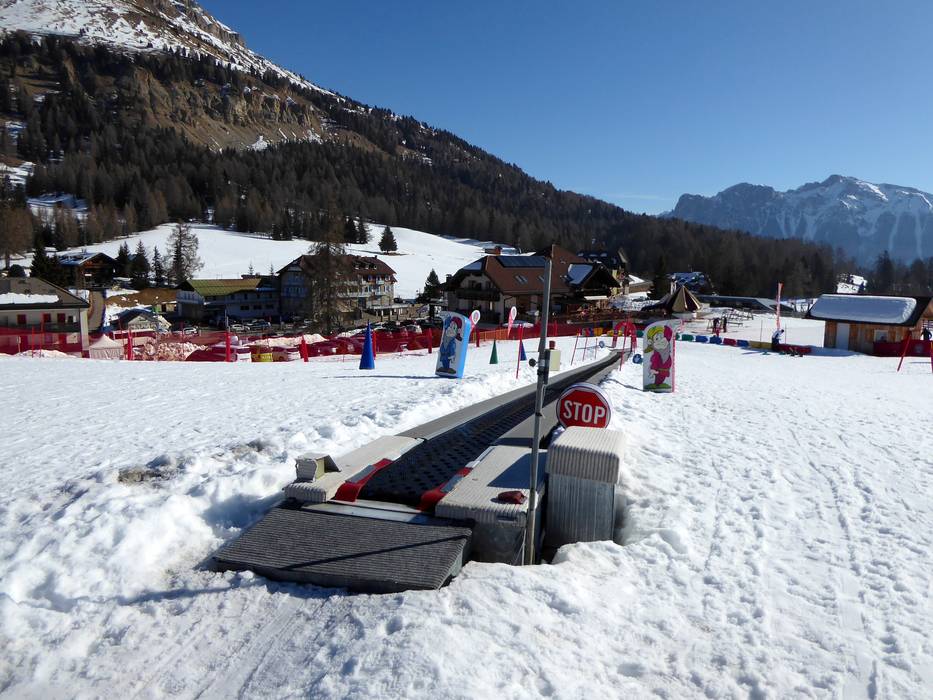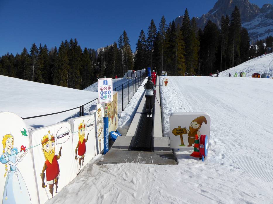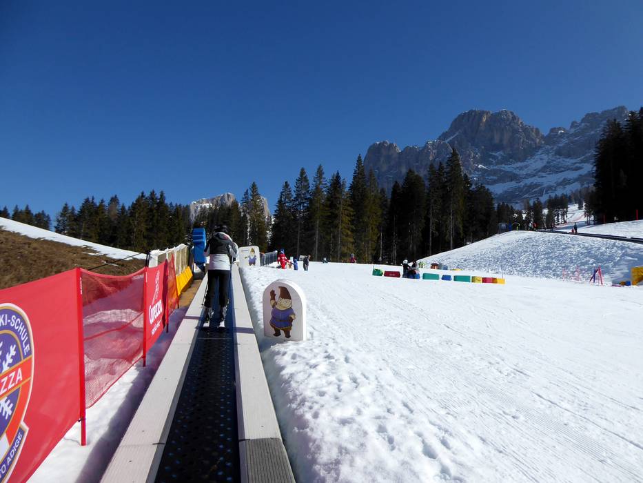 Het mooie Kinderland van de skischool Vigo die Fassa ligt direct op de Karerpass. Met grappige figuren en een transportband leer je snel.