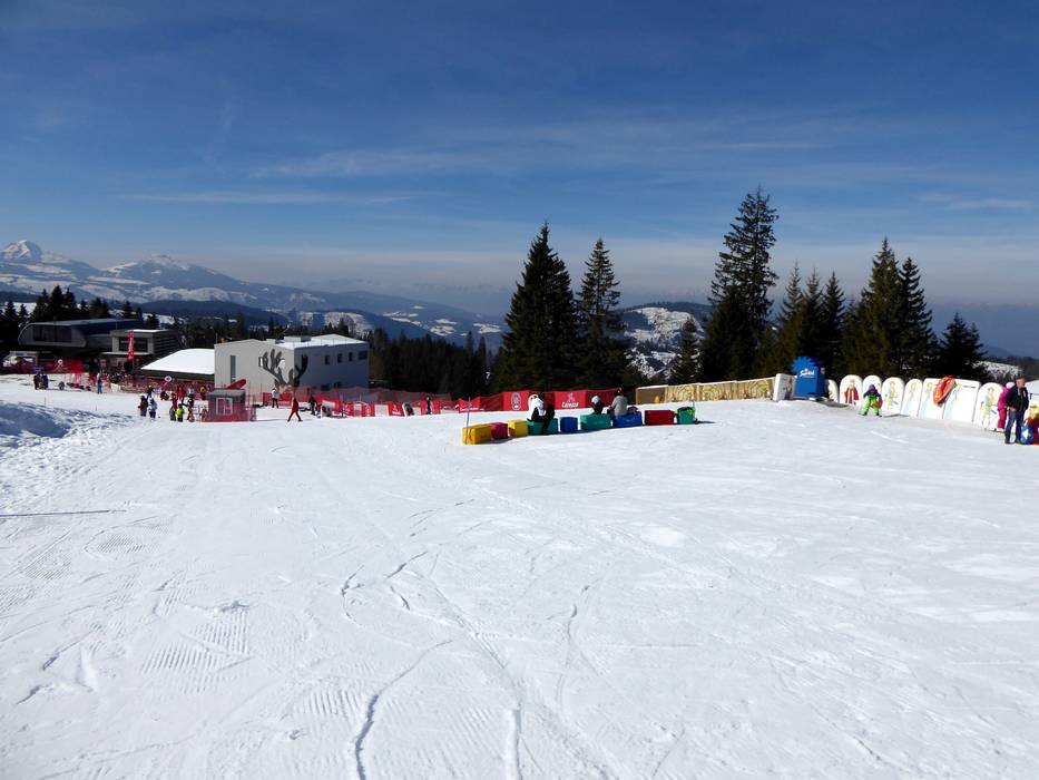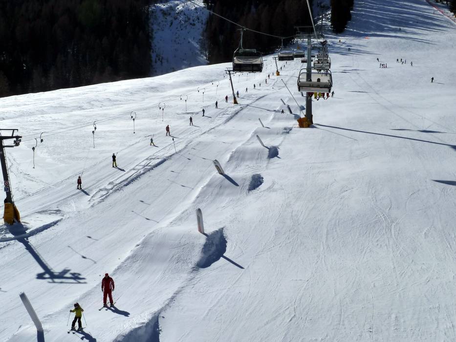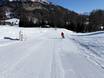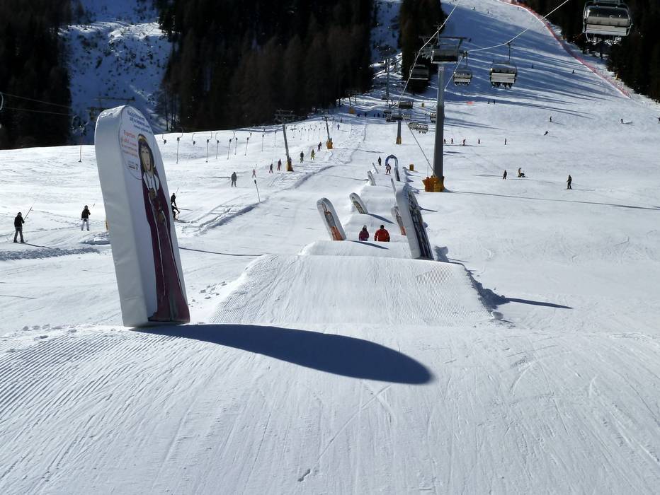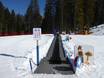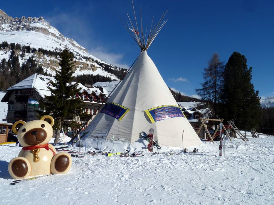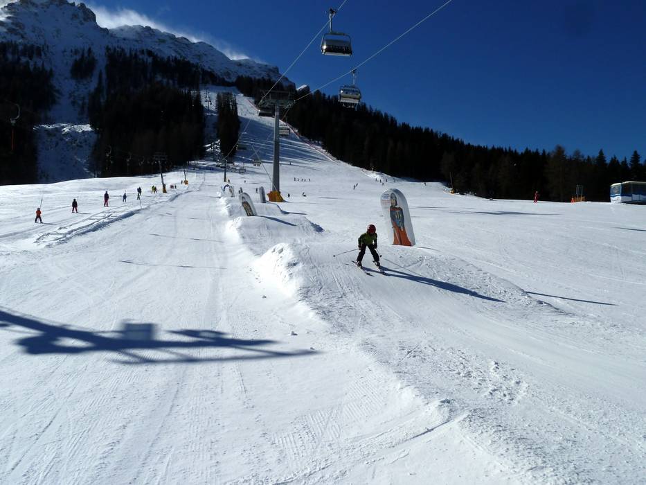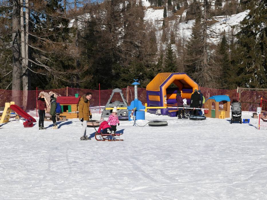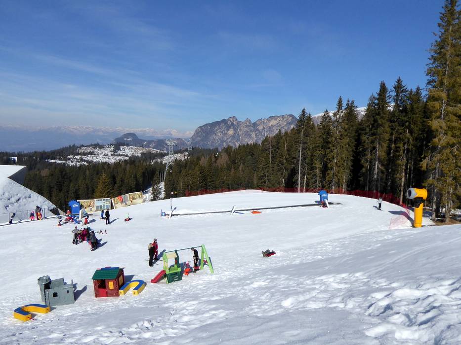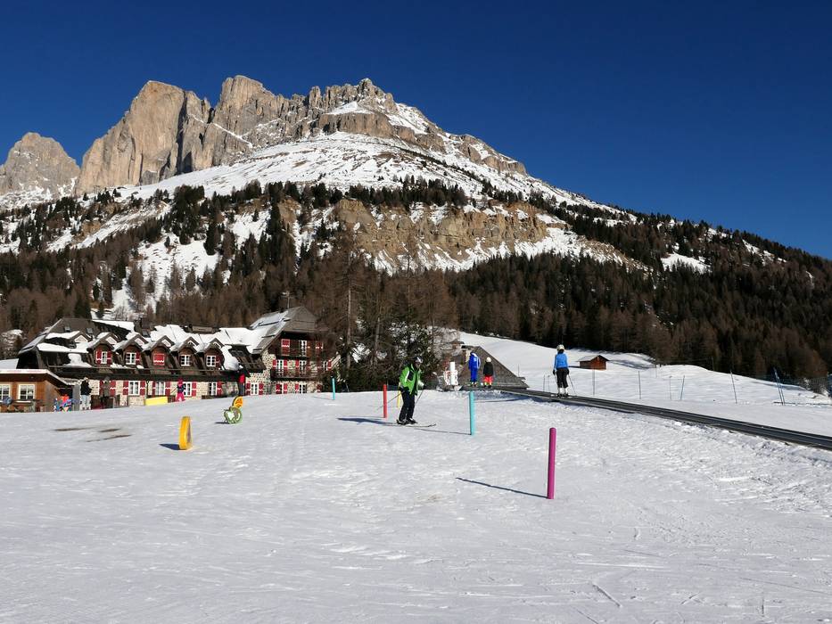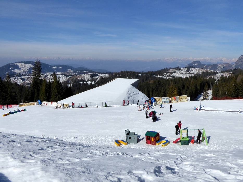 Het mooie Kinderland van de skischool Vigo die Fassa ligt direct op de Karerpass. Met grappige figuren en een transportband leer je snel.