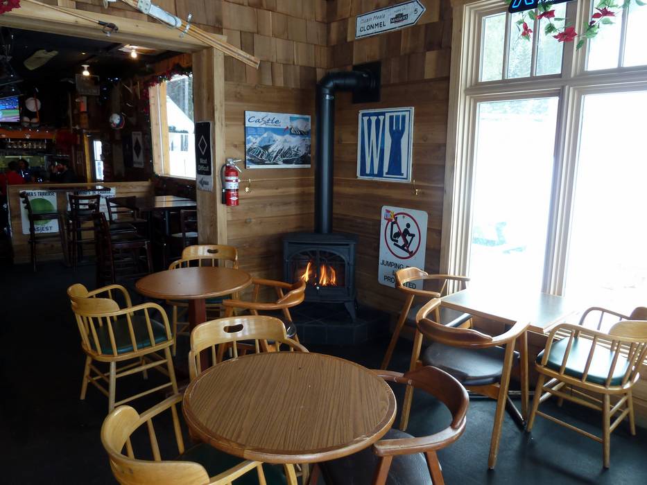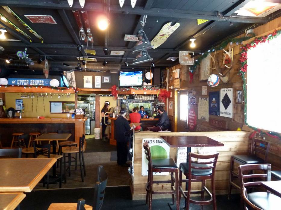 Een gezellige huttensfeer, goed bier en snacks maken de T-Bar Pub and Grill tot een uitstekende après-ski locatie bij Castle Mountain.