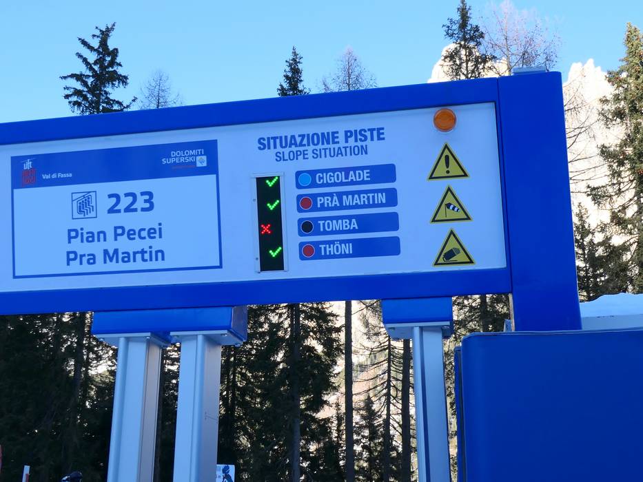 Grote informatieborden tonen het pisteplan en de actuele openingsstatus van de liften en pistes. De bewegwijzering en markeringen op de pistes zijn duidelijk en eenduidig.