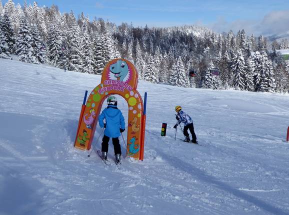 Bij de sleeplift DinoJet leren kinderen spelenderwijs skiën en lift rijden.
