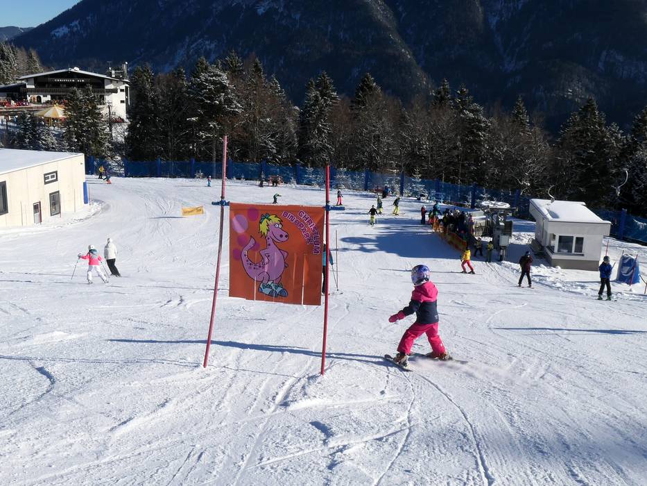 Bij de sleeplift DinoJet leren kinderen spelenderwijs skiën en lift rijden. Kleine snowpark-hindernissen staan klaar.