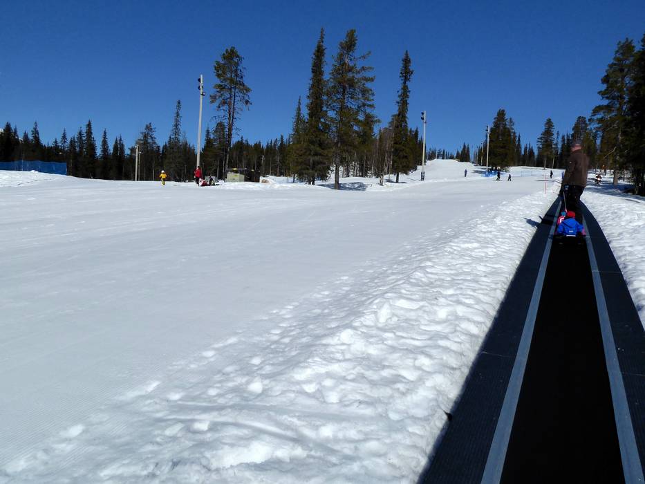 Direct naast het dalstation is er een afgebakend gebied met een transportband. Hier kunnen de kleintjes in alle rust hun eerste bochten oefenen of een ritje op de slee maken.