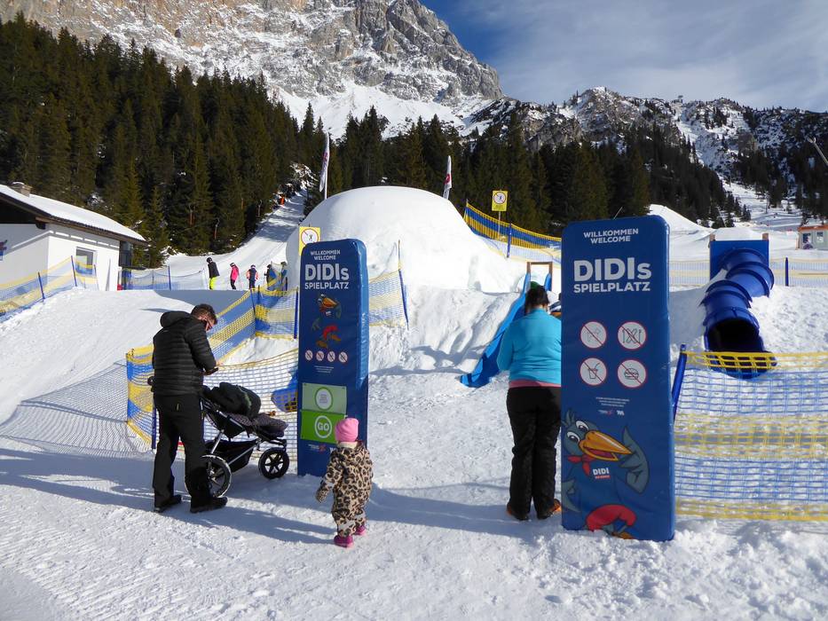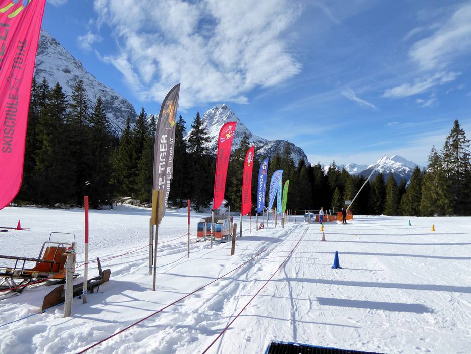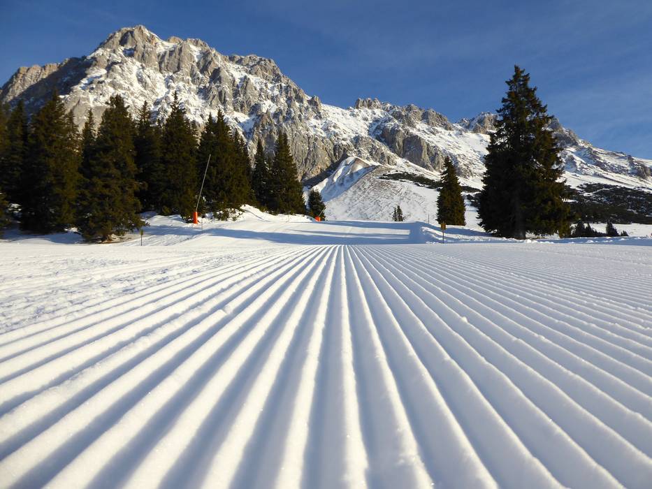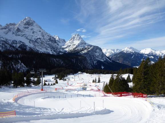 Het skigebied Ehrwalder Alm – Ehrwald ligt in de Tiroler Zugspitz Arena (Oostenrijk, Tirol, Außerfern).