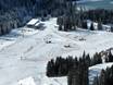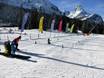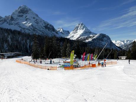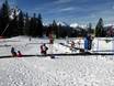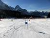 Eigen gebied met sleeplift op de Ehrwalder Alm. Hier kunnen ouders ook als niet-skiërs met de gondelbaan de berg op en hun kleintjes bij de eerste bochten toekijken.