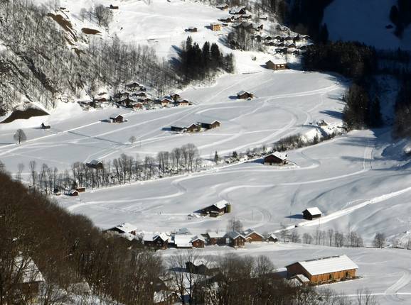 De loipes lopen direct langs het skigebied en het dorp Elm.