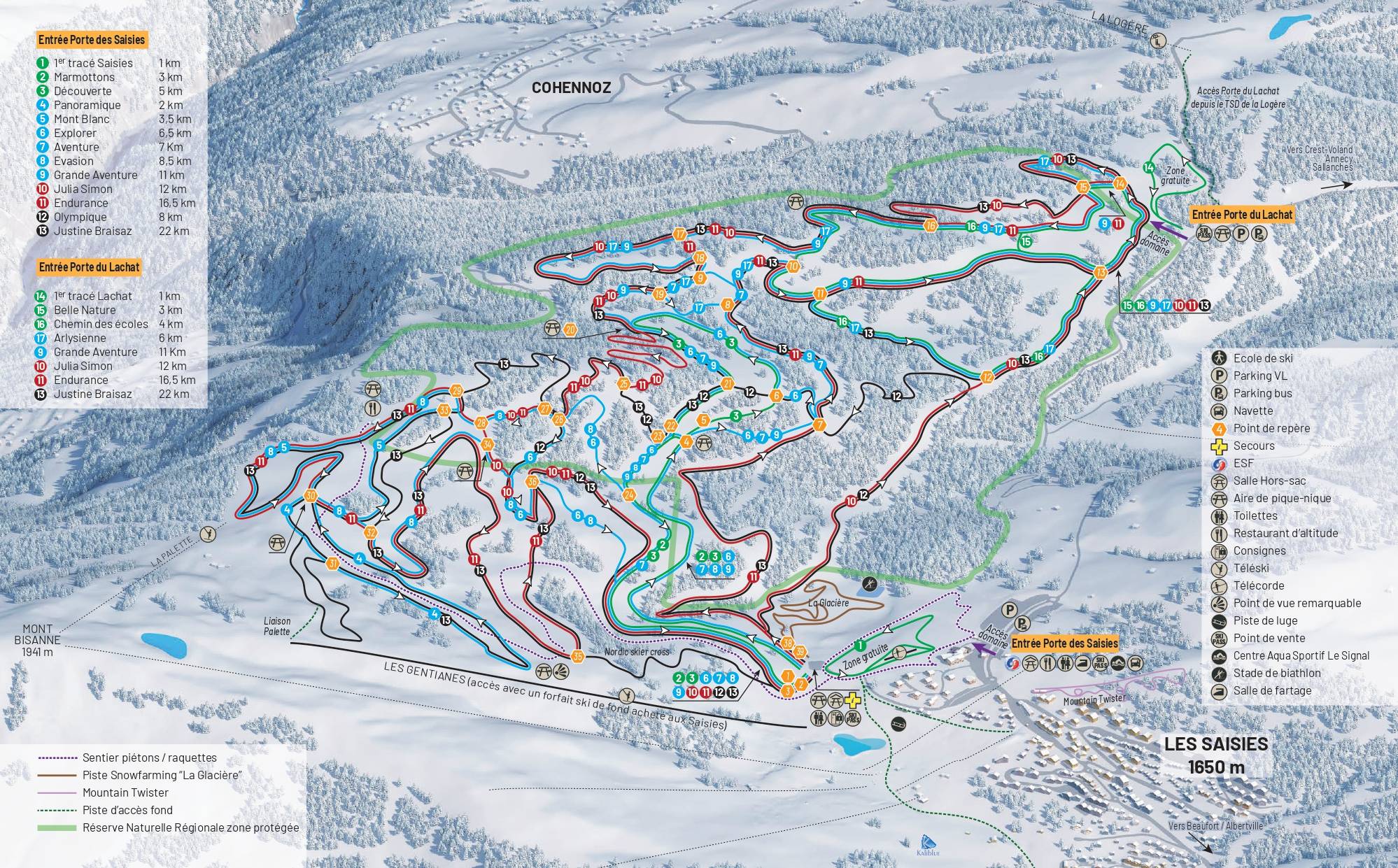 Ondanks de grootte van het gebied en de verschillende liggingen van de hellingen biedt het pisteplan een zeer goede oriëntatie en geeft het het terrein grotendeels correct weer. De pistes zijn met hun namen aangegeven, waardoor je op elk moment gemakkelijk je huidige locatie kunt bepalen.