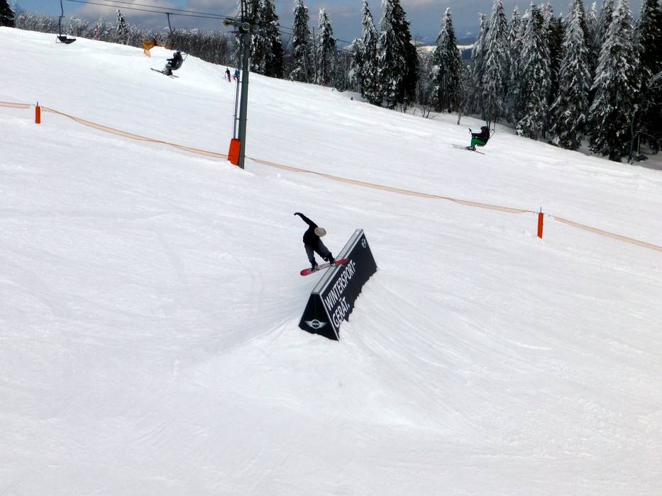 Gelegen aan de Seebuck biedt de MINI Snowpark Feldberg een goede selectie van verschillende obstakels en kickers.