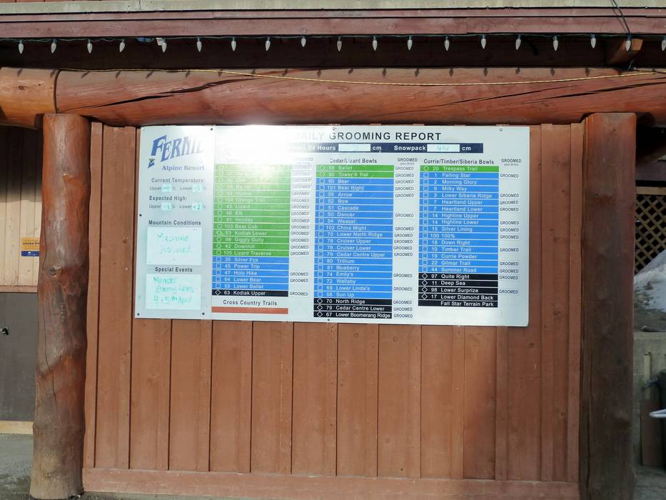 Het pisteplan van Fernie geeft het hele skigebied met alle liften en pistes zeer overzichtelijk weer. Alle pistes zijn met naam aangegeven. Bepaalde delen van het skigebied, zoals bijvoorbeeld de Polar Peak, de Cedar Bowl of het Village, worden extra gedetailleerd weergegeven.