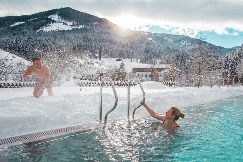 Wellness na een geslaagde skidag – ons waterland met het verwarmde buitenzwembad (31 graden), het binnenzwembad en whirlpool, evenals de saunawereld met een reis rond de wereld – pure ontspanning.