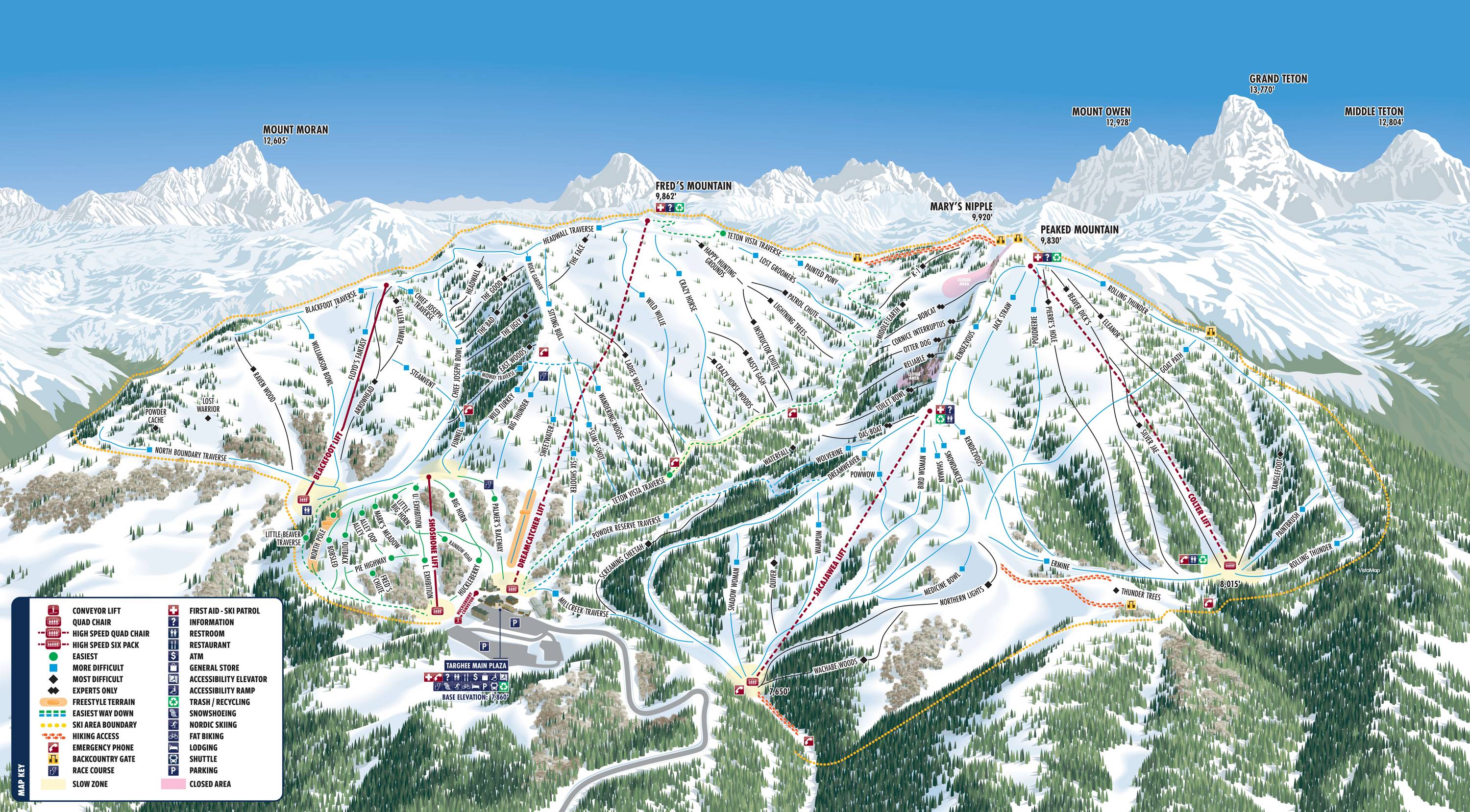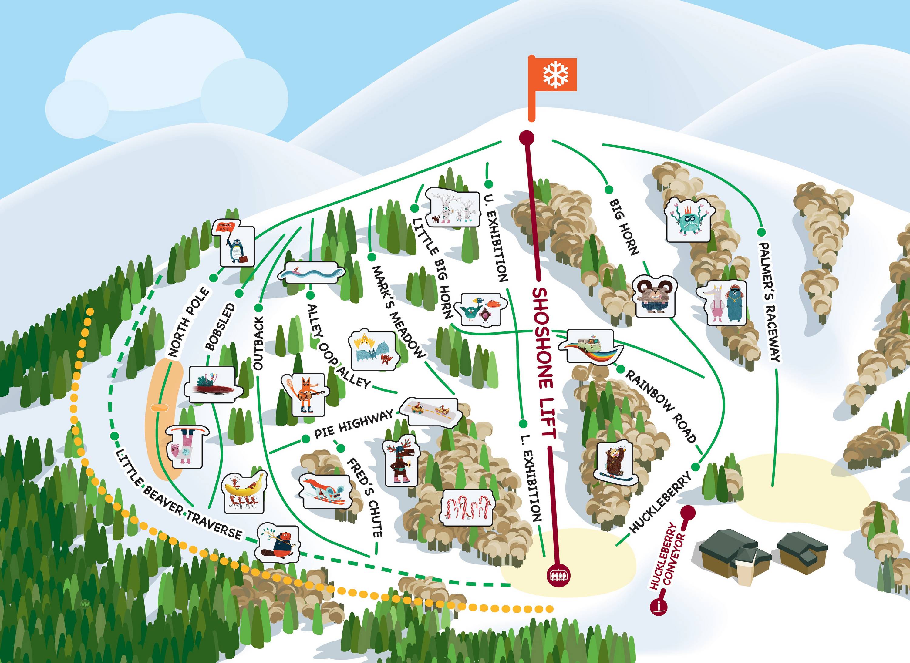 Het pisteplan geeft het hele skigebied Grand Targhee zeer goed weer. Alle liften en pistes zijn met detailinformatie aangegeven. Je vindt hoogtegegevens, activiteiten, restaurants, parkeerplaatsen en alle belangrijke informatie. Daarnaast is er een apart pisteplan genaamd Gheeville voor families en beginners.