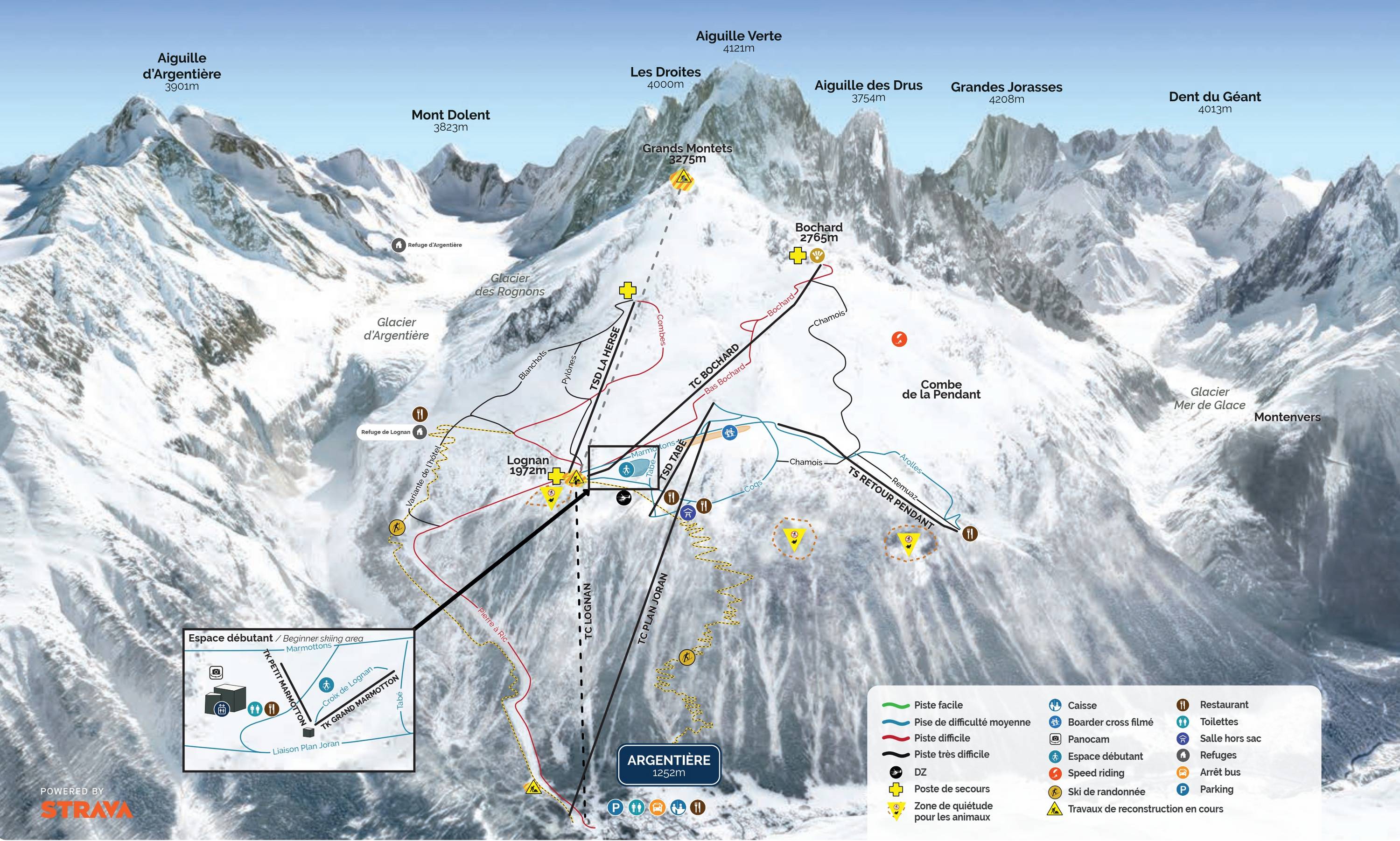 Oriëntatie (pistekaart, informatieborden, bewegwijzering piste) en veiligheid in het skigebied Grands Montets – Argentière (Chamonix)