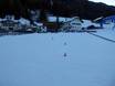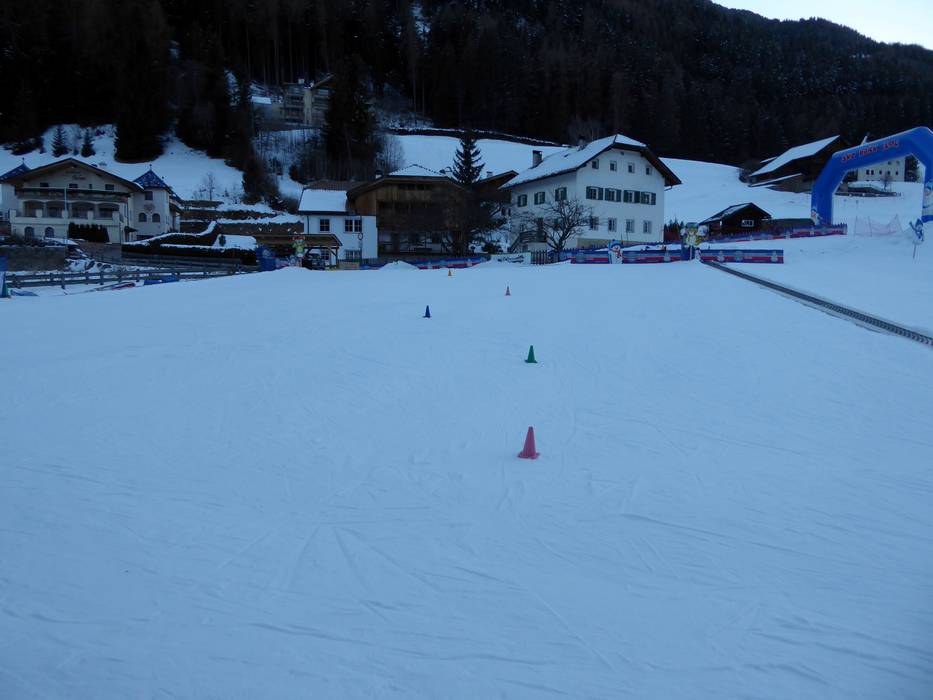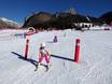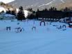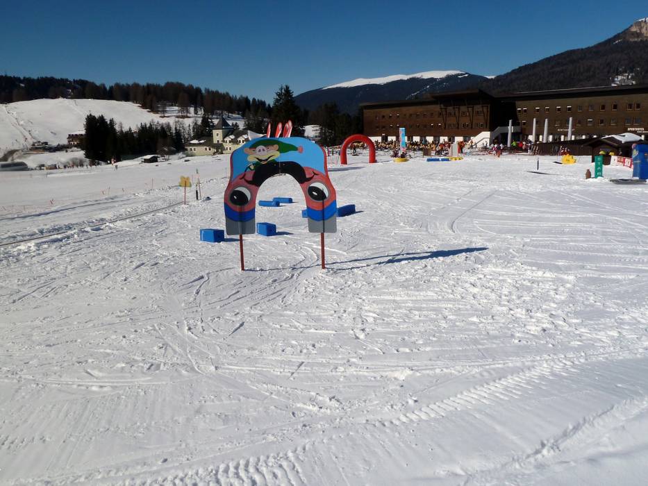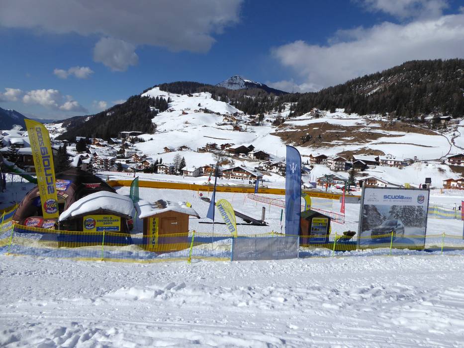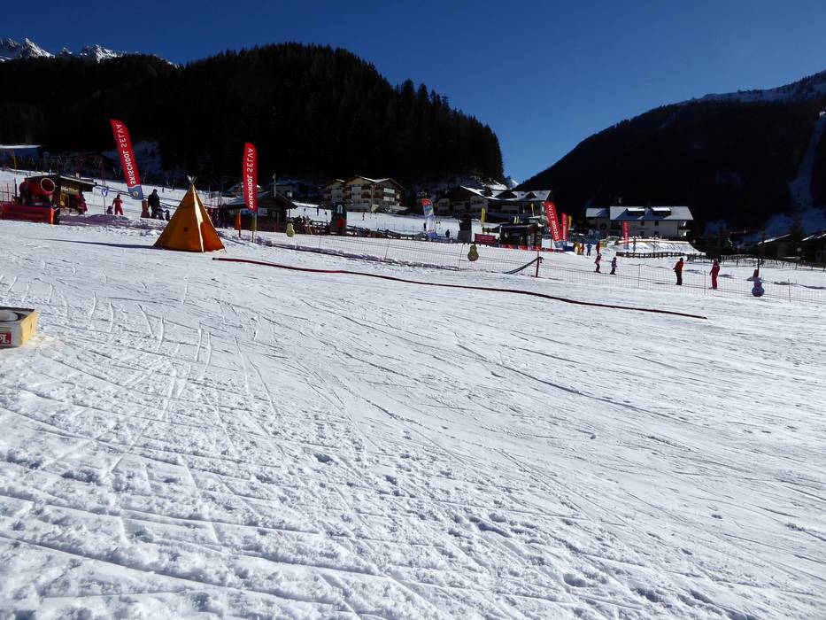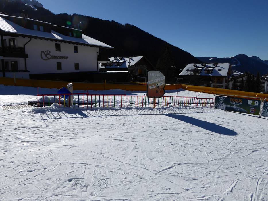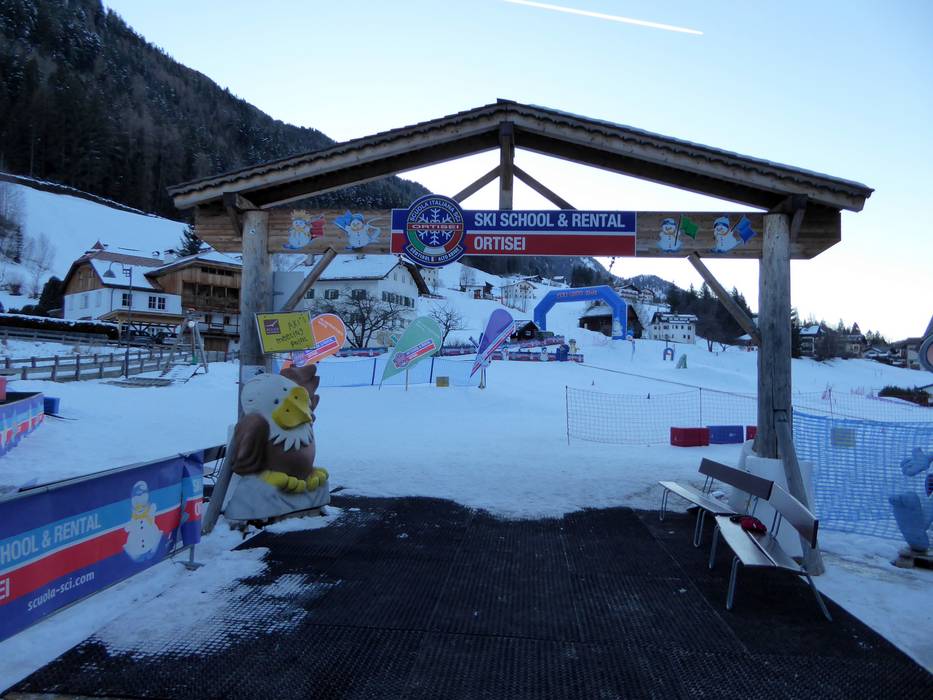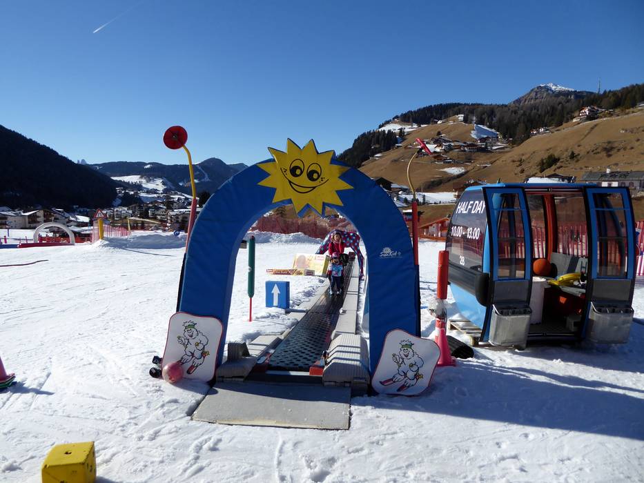 Skischule 2000 runt in Wolkenstein een klein kinderland met een transportband voor de eerste pogingen in de sneeuw.