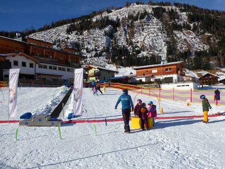 Gezinsaanbiedingen/familievriendelijkheid Großglockner Resort Kals-Matrei Kinderen onder de 6 jaar skiën gratis – ook op het beginnersskigebied en in de skischolen. Het kindertarief geldt tot 18 jaar. Er zijn kinderlanden bij het bergstation Matrei Goldried en bij de dorplift in Kals, met alles wat daarbij hoort: Bobo’s Kinderclub, Eddy de steenbok, een kindervriendelijk transportband, een kinderspeelpark met verwarmde ruimte en een ruim skischoolgedeelte voor kinderen. Direct bij het Gradonna Mountain Resort bevindt zich nog een kinderland met een tovertapijt. Hier kan men zelfs gratis oefenen.
