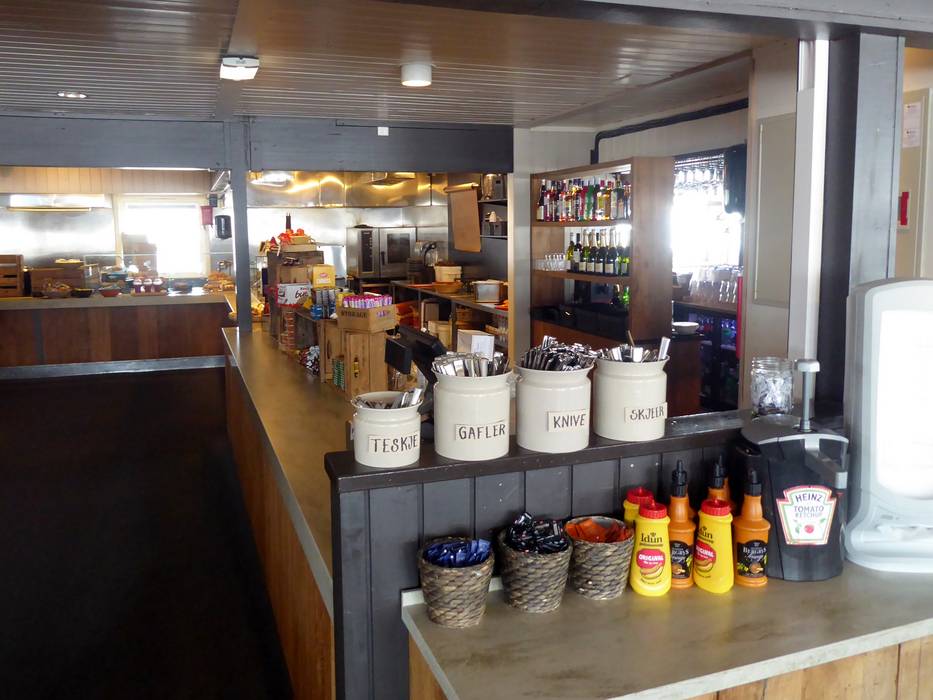 Het café is ingericht in een traditionele Noorse stijl – warm en uitnodigend met rustieke houten meubels. Bij mooi weer kun je op het zonneterras genieten van het prachtige berguitzicht.