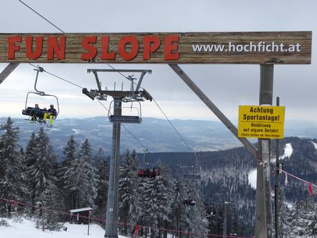 Het skigebied Hochficht biedt een snowpark, een funslope en golvenbanen verspreid over het wintersportgebied.