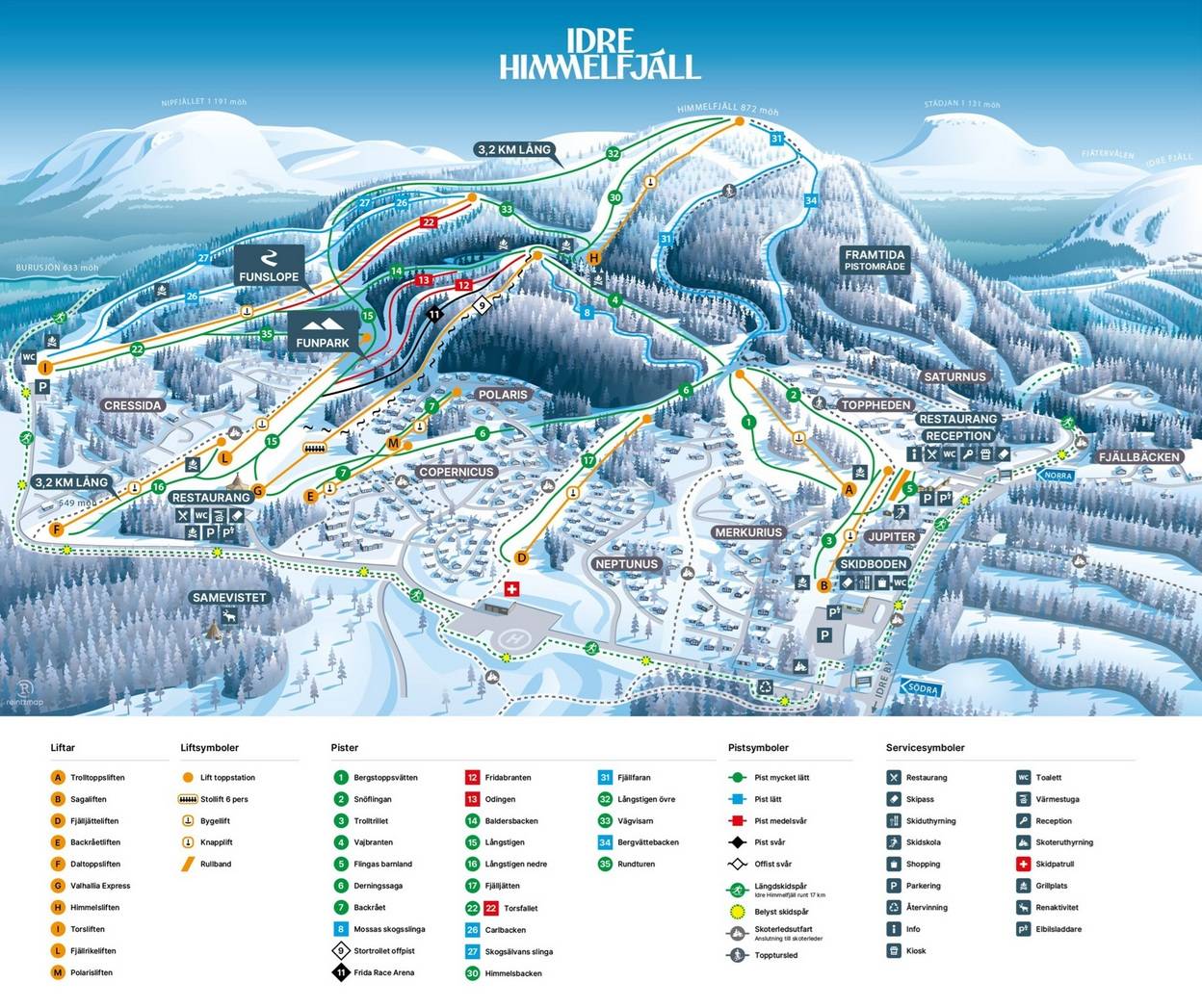 Het pisteplan van het skigebied Idre Himmelfjäll is overzichtelijk en biedt alle informatie. Alle skiliften, pistes en andere faciliteiten zijn aangegeven.