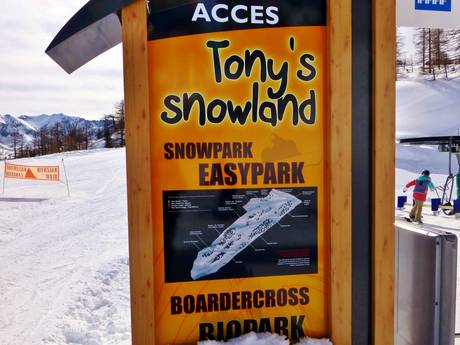 Het skigebied Isola 2000 heeft een snowpark aan de westelijke kant van het skigebied. Dit is bereikbaar met de gondelbanen Pelevos en Mercantour. Een gereduceerde skipas geeft alleen toegang tot het snowpark. De 4-persoons stoeltjeslift Marmottes maakt herhaalde afdalingen in het snowpark mogelijk, zonder dat je steeds terug naar het dal hoeft te gaan.