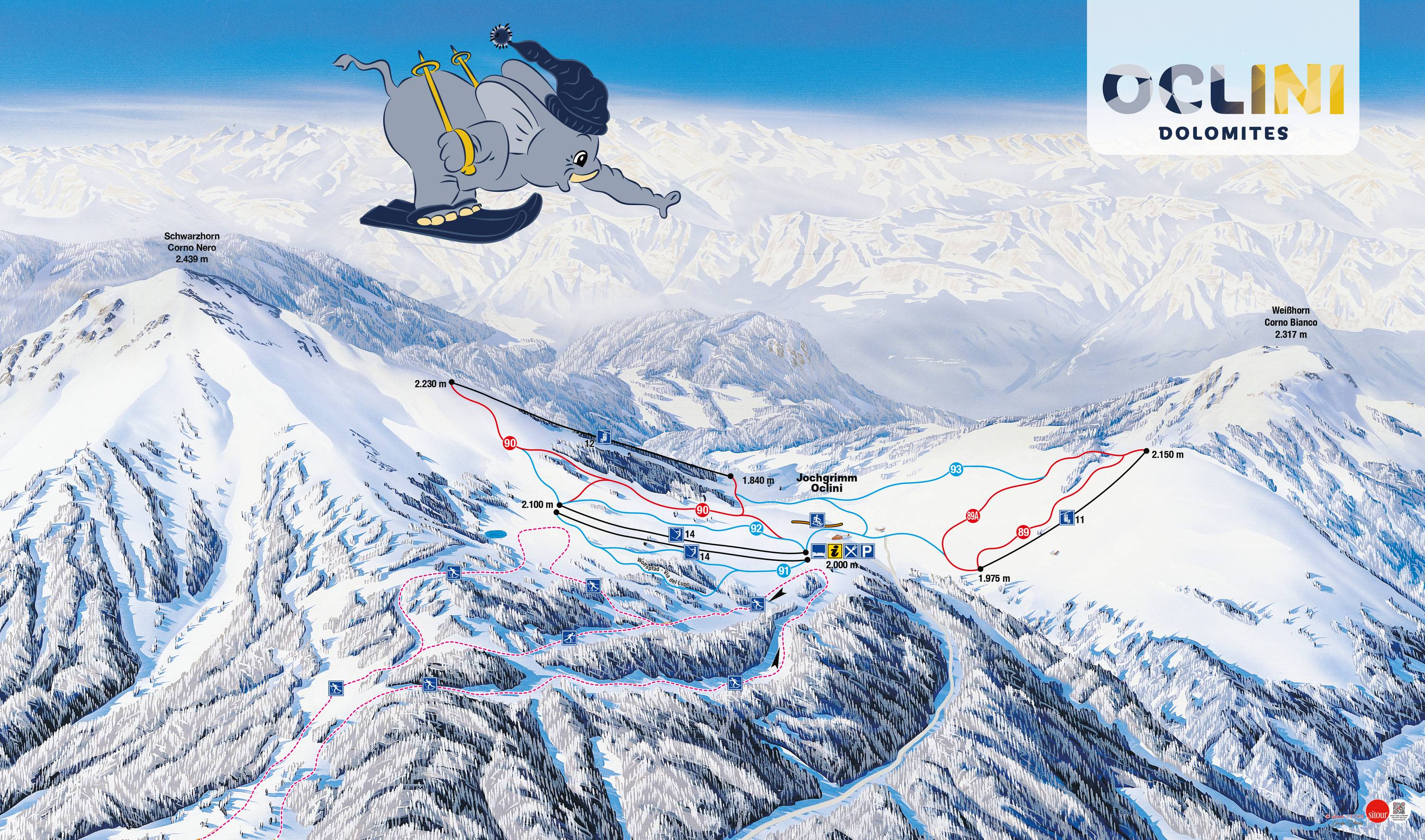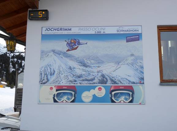 Het pisteplan van Jochgrimm geeft het kleine skigebied goed weer. Alle pistes en liften zijn te vinden. Daarnaast is het skigebied ook opgenomen in het pisteplan van Dolomiti Superski in Val di Fiemme/Obereggen.