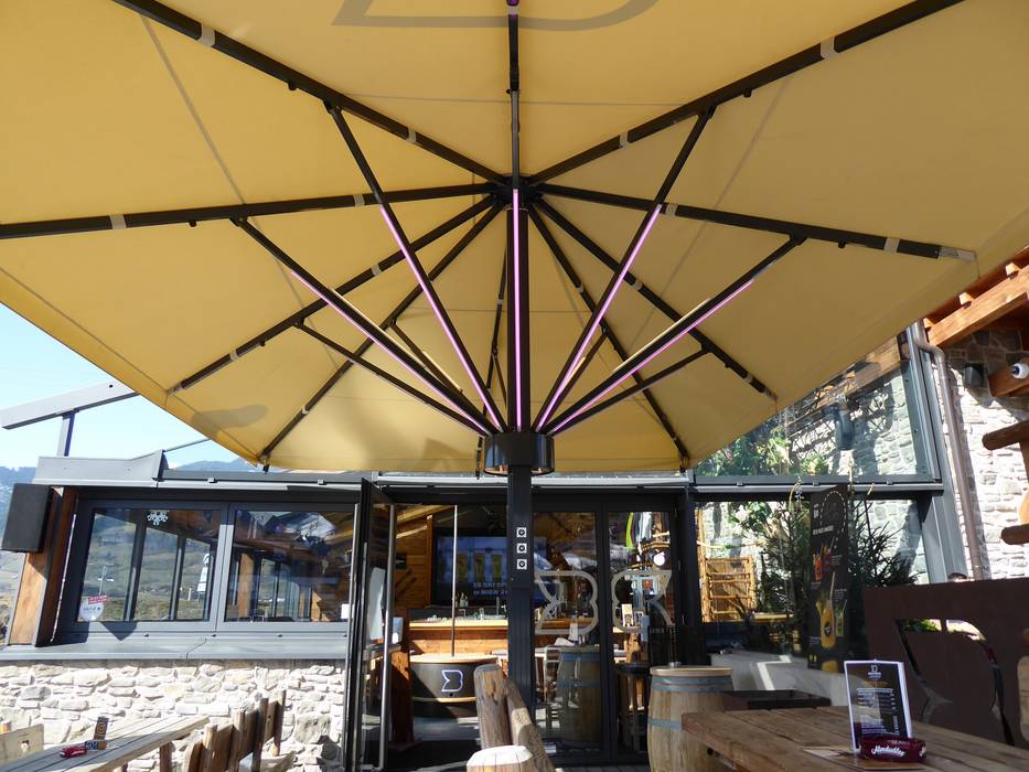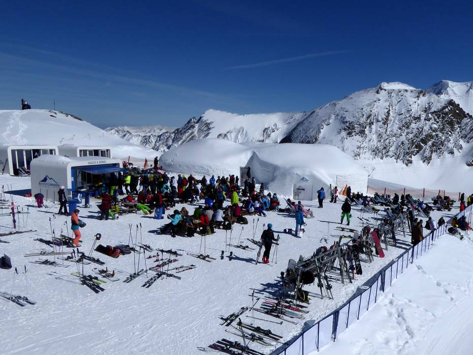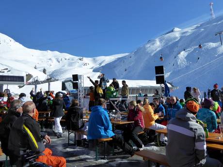 Goede sfeer met geweldige muziek tot aan de laatste afdaling. De Parasol-Schirmbar is het middelpunt van het grote, op het zuiden gelegen terras voor het Alpincenter.