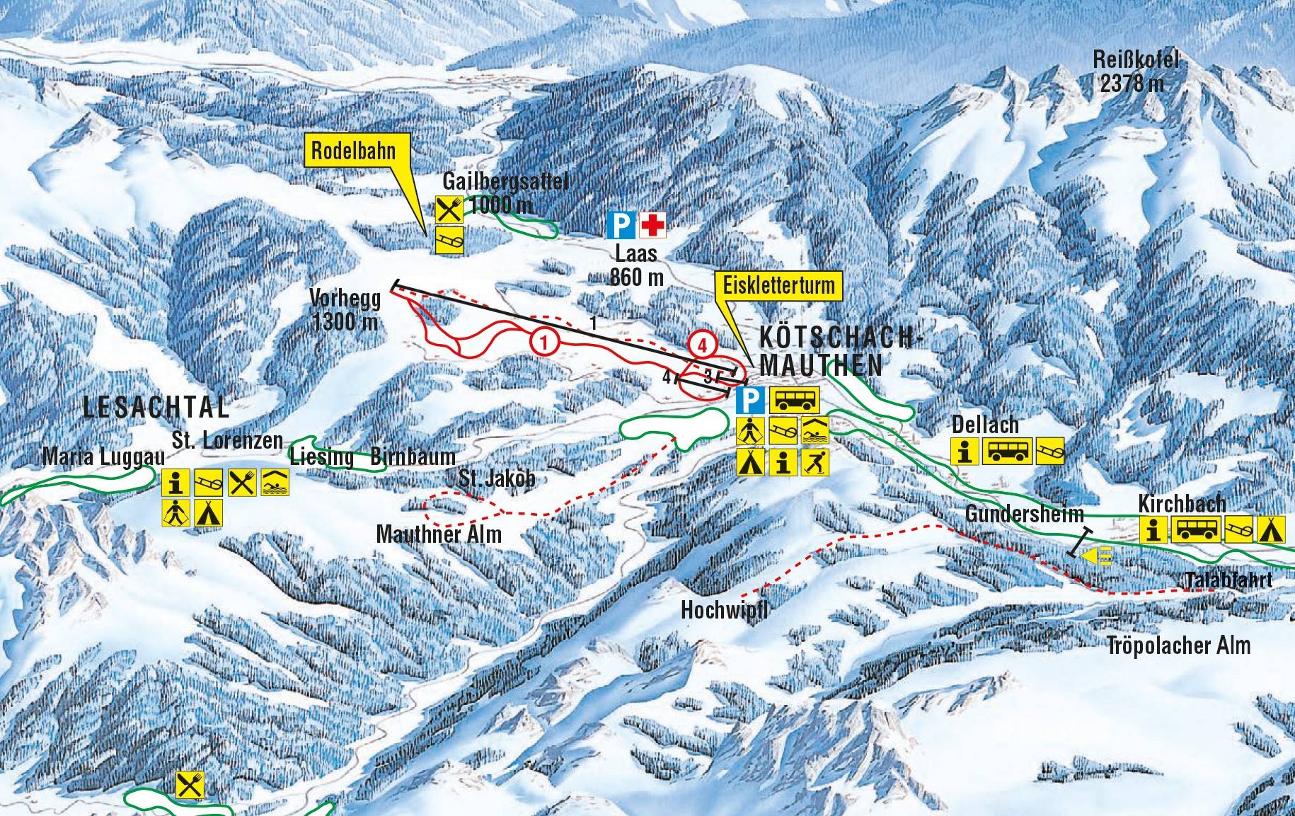 Kötschach (0,8 km), Kötschach-Mauthen (0,9 km), Mauthen (2 km), Laas (0,1 km) Plaatsen bij het skigebied
