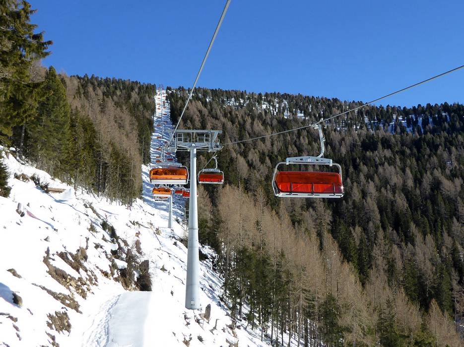 De Panoramabahn Sixpack is een 6-persoons stoeltjeslift met oranje weerbeschermkappen.