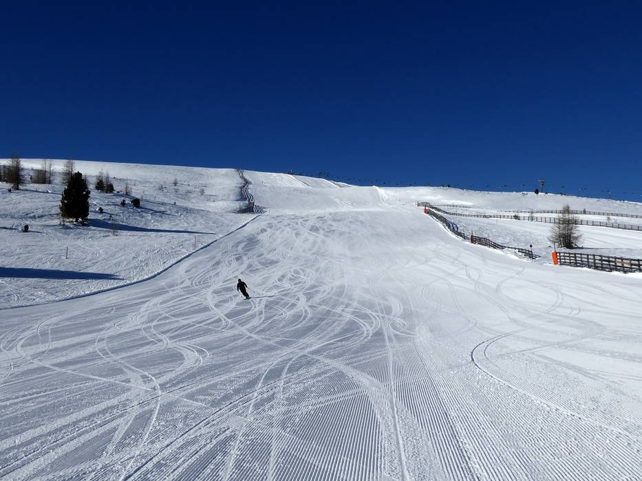 De middelzware piste 9 loopt in het bovenste gedeelte boven de boomgrens en biedt een prachtig uitzicht op het omliggende landschap. In het onderste deel slingert de piste zich door het voor het skigebied kenmerkende dennenbos. - Piste 5