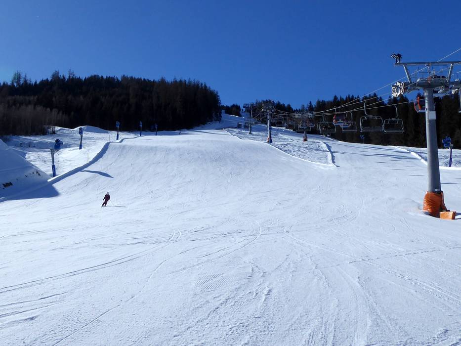 Langs de Kreischberg 10-persoons gondelbaan 1e sectie: De zwarte piste 1 naar het dalstation splitst zich in het onderste gedeelte en biedt zo meerdere afdalingsmogelijkheden.