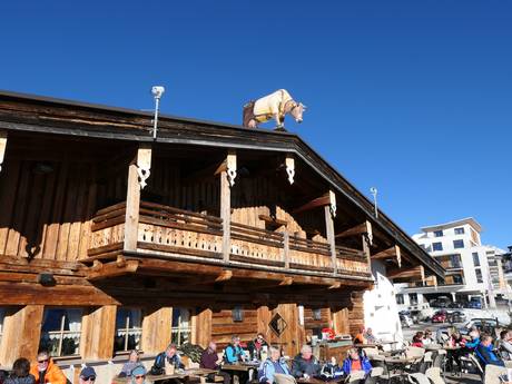 De gezellige houten berghut met zonnig terras nodigt uit om na het skiën even te blijven hangen.