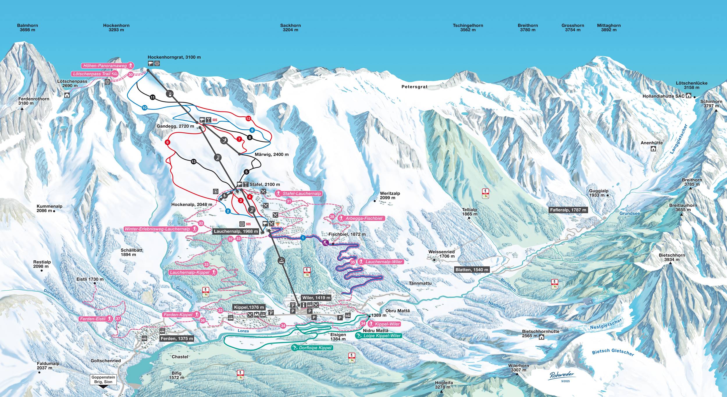 Het pisteplan geeft een zeer goed overzicht van het skigebied Lauchernalp. Alle liften en pistes zijn aangegeven. De horecagelegenheden zijn zonder namen van de hutten/restaurants ingetekend. Daarnaast vind je informatie over de winterwandelwegen en loipes. Op de achterkant staan alle informatie over de zomer. Bij de kassa’s en in de hotels zijn er kleine kaartjes met het tijdschema van de kabelbaan.