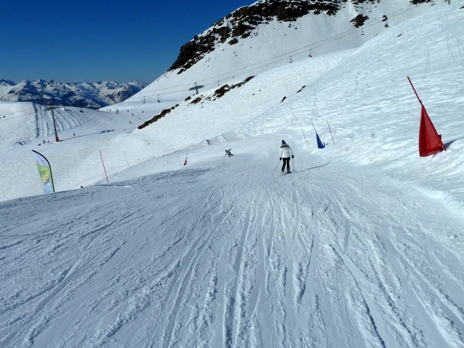 De verbindingspistes "ours" naar Méribel-Mottaret en de piste "bd cumin" naar Les Menuires zijn vrij vlak en hebben grotendeels het karakter van een sleepweg. - heel veel off-piste /Tiefschneegedeelten