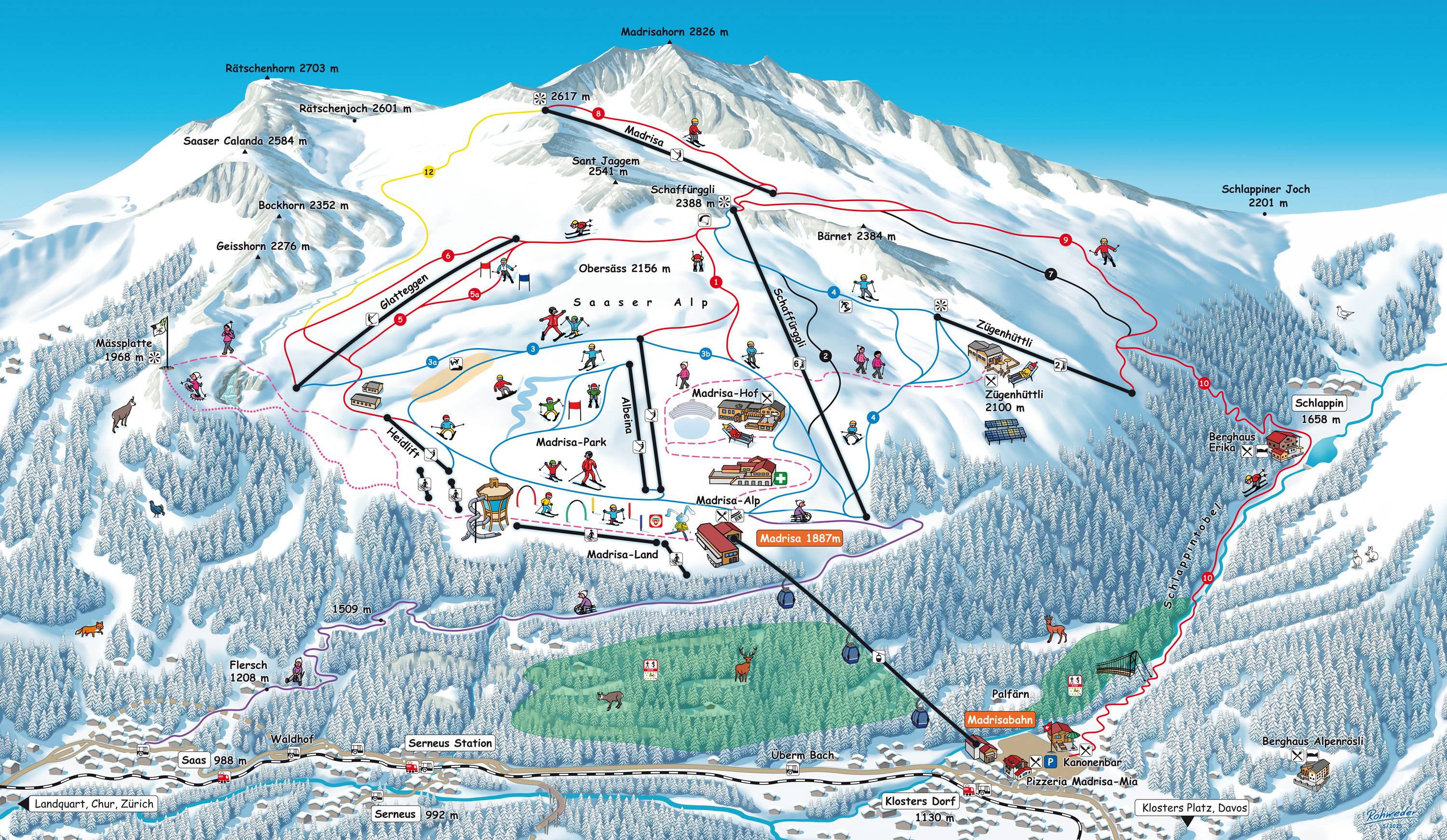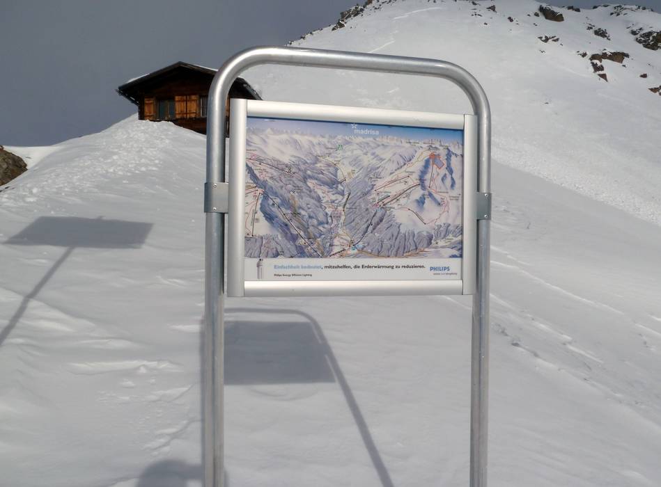 Oriëntatie (pistekaart, informatieborden, bewegwijzering piste) en veiligheid in het skigebied Madrisa (Davos Klosters)