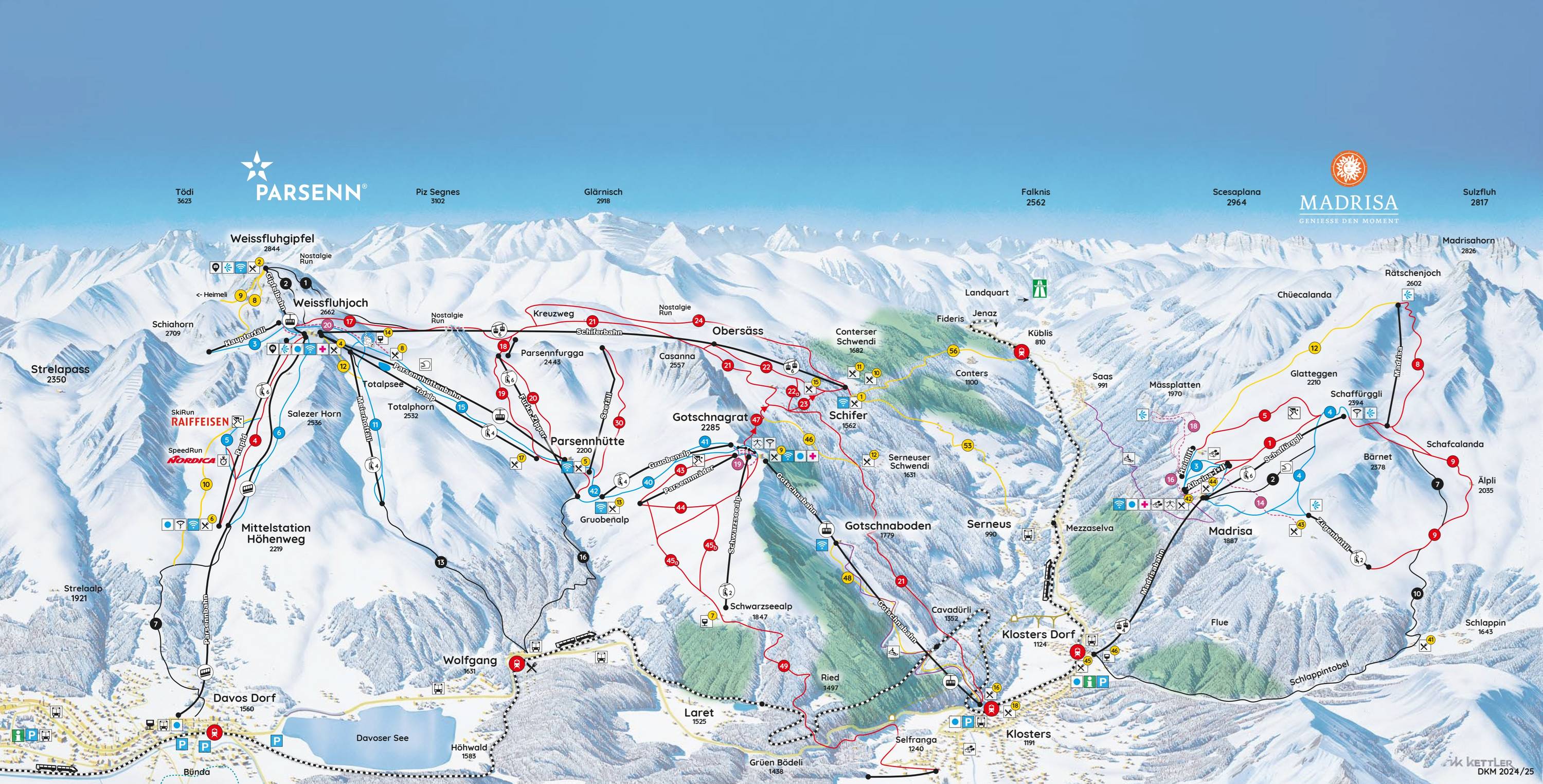 Overal zijn handige pistekaarten in zakformaat verkrijgbaar. Op de pistekaarten staan de informatie over de vijf skigebieden van de bestemming Davos Klosters aangegeven. Alle pistes, liften, bergrestaurants en de Rhätische Bahn zijn beschreven. Daarnaast is er een aparte dienstregeling voor de lokale bussen en een extra kaart met tarieven en informatie.