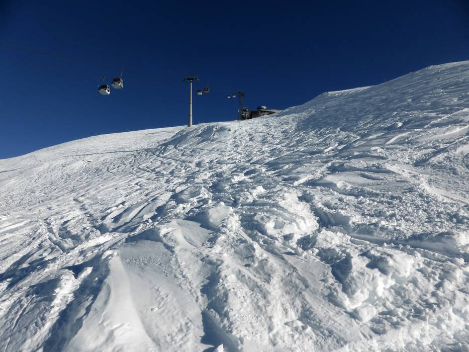 De steilste afdaling van het skigebied loopt onder de gondelbaan van de Alpentower naar de Mägisalp.