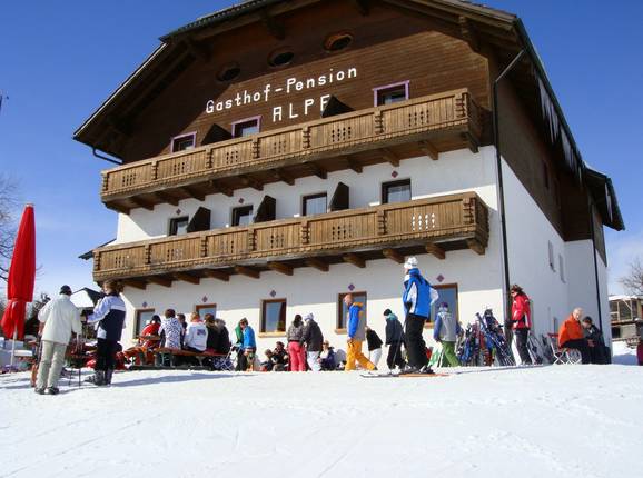 De Almberghütte ligt op de zonnige helling naast de uitzichtsrots en 100 meter onder het Gipfelkreuz. Populair zijn de curryworst en de creatieve hutdrankjes. Op het zonneterras kun je de skidag gezellig afsluiten.
