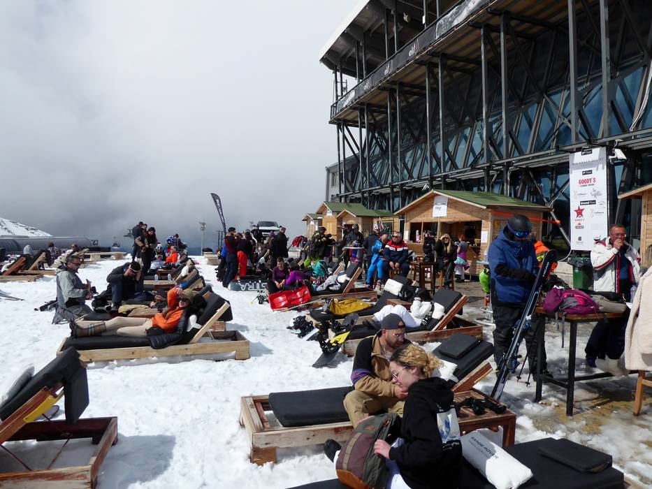 In het weekend vieren wintersporters feest met goede muziek voor het chalet. Een dj zorgt voor de juiste sfeer. Hier is het dan echt feest.