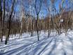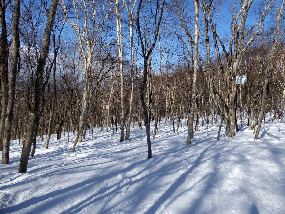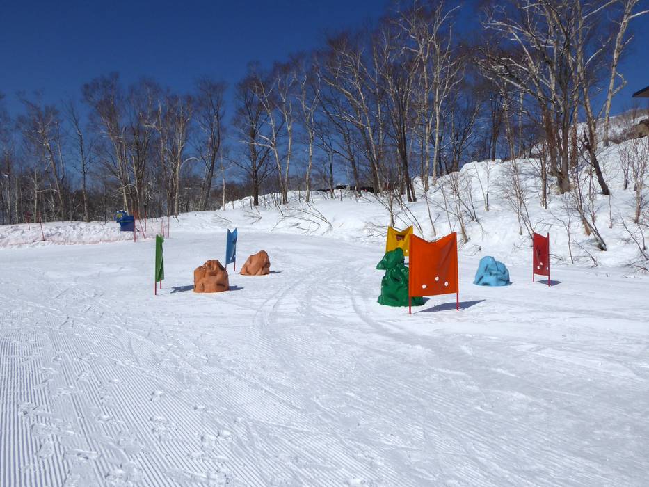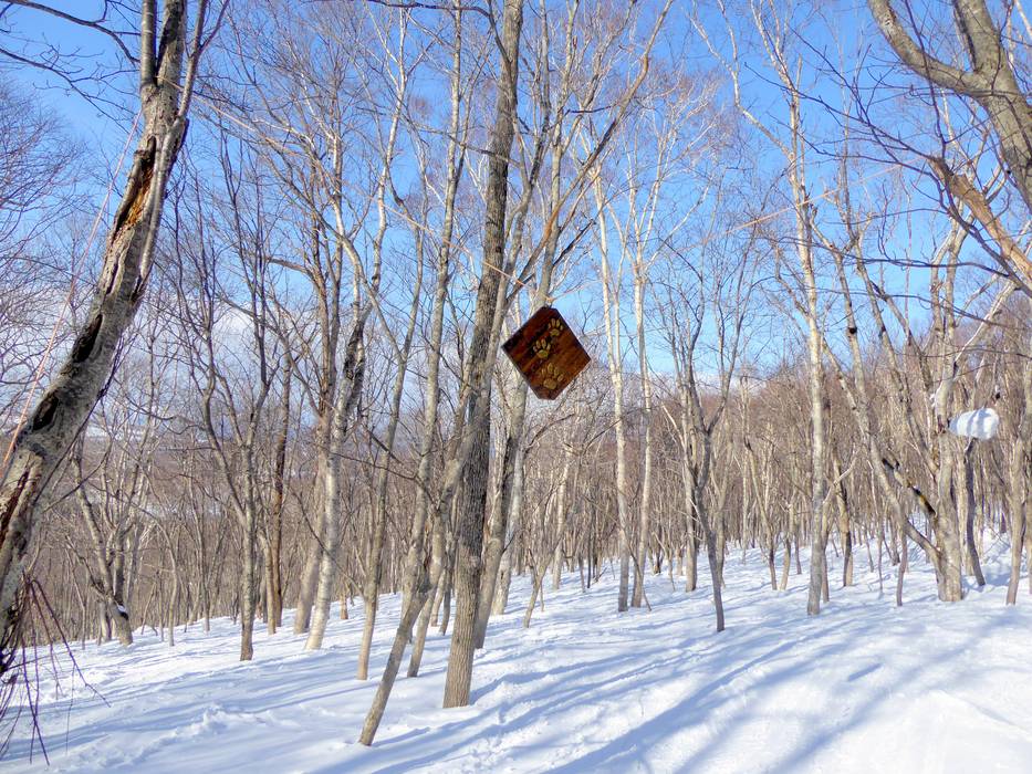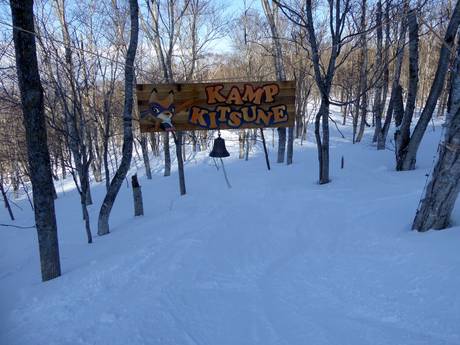 Het Kamp Kitsune is een bospad voor kinderen. Op de dalafdaling naar Hanazono kun je hier door het lichte bos skiën en figuren ontdekken.