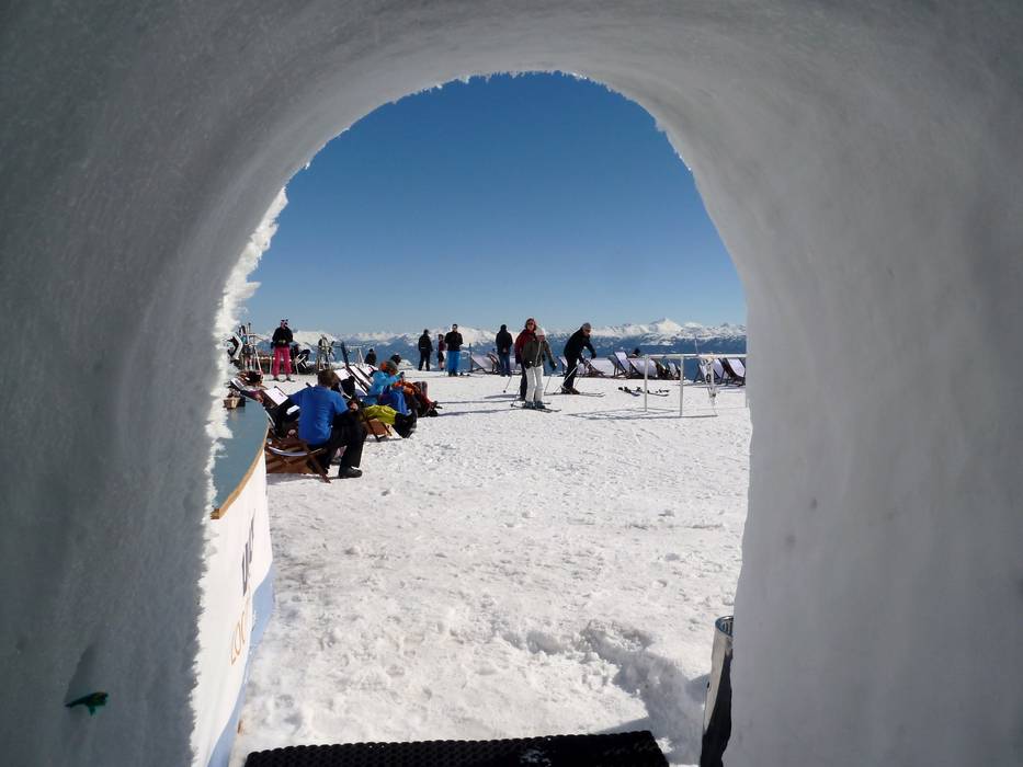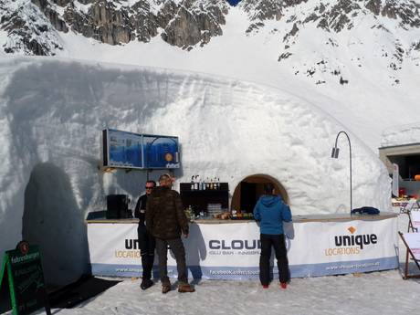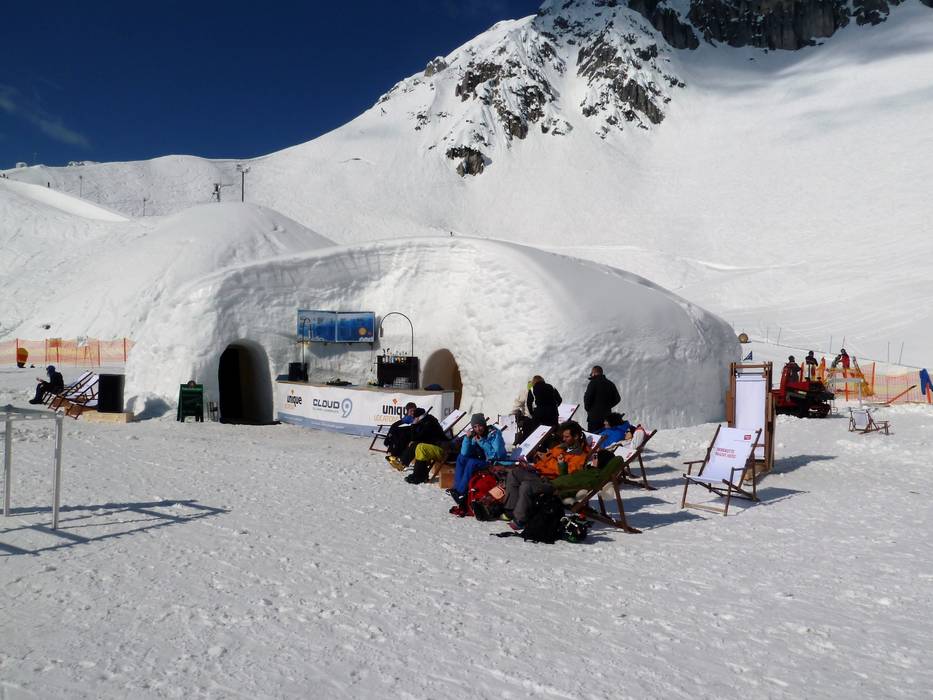 De Iglubar Cloud9 is de grootste sneeuw-iglo evenementenarena van de Alpen. Twee bars nodigen uit voor cocktails en snacks. Bij mooi weer kun je in een ligstoel van de zon genieten.