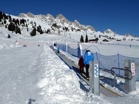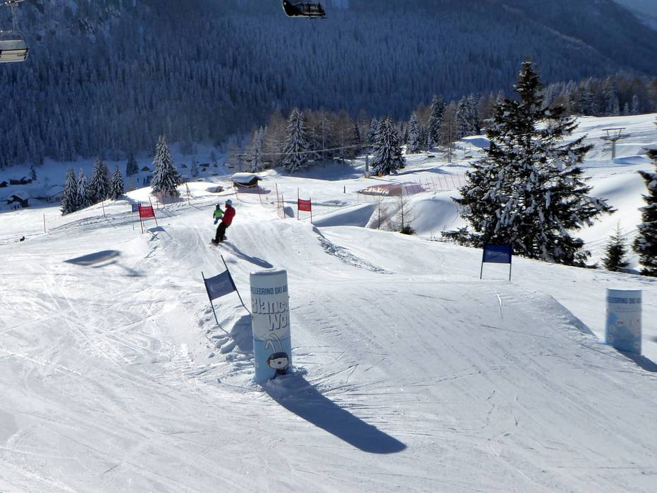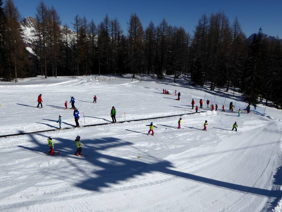 De skischool "Scuola italiana Sci e Snowboard Moena Dolomiti" runt het grote kinderland bij de Passo San Pellegrino. Twee tovertapijten en vrolijke figuren maken het leren skiën kinderspel.