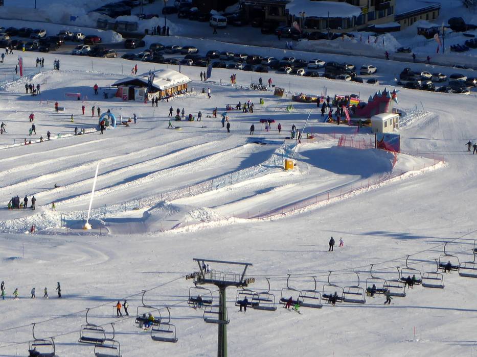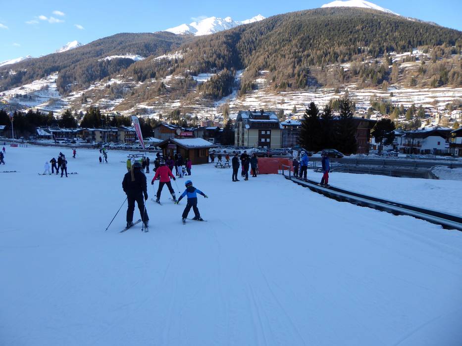 Het oefenterrein met transportband bevindt zich direct bij het dalstation in Ponte di Legno.