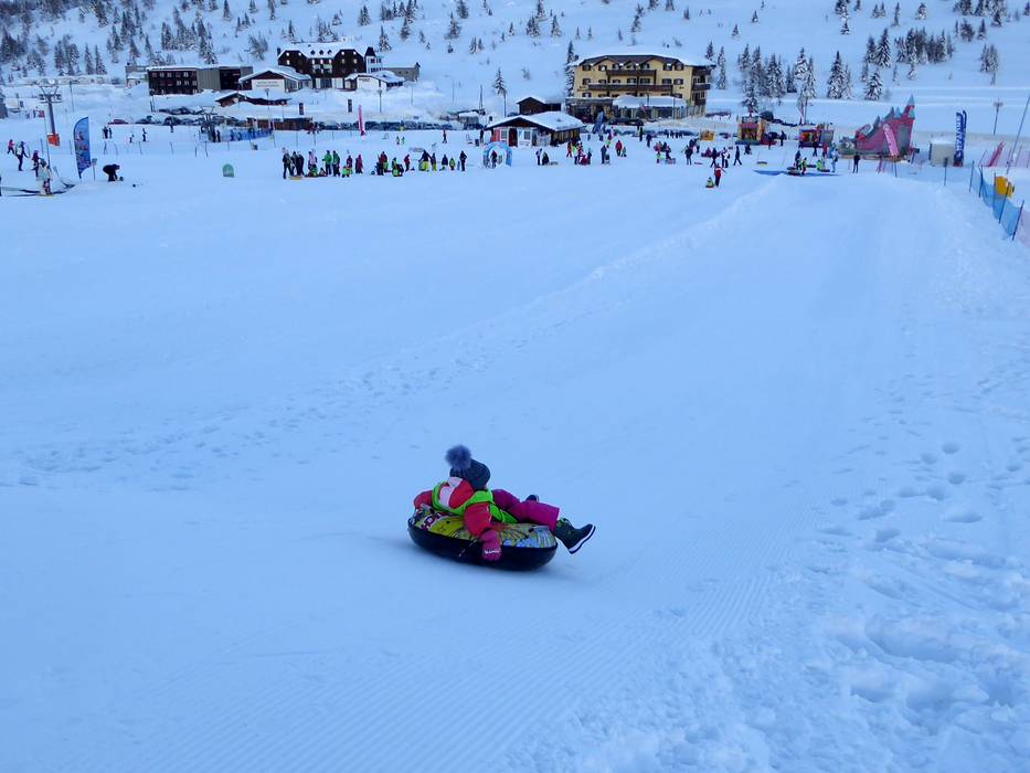 Snow Tubing is een groot plezier. De baan bevindt zich op de Passo Tonale bij La Baracca.