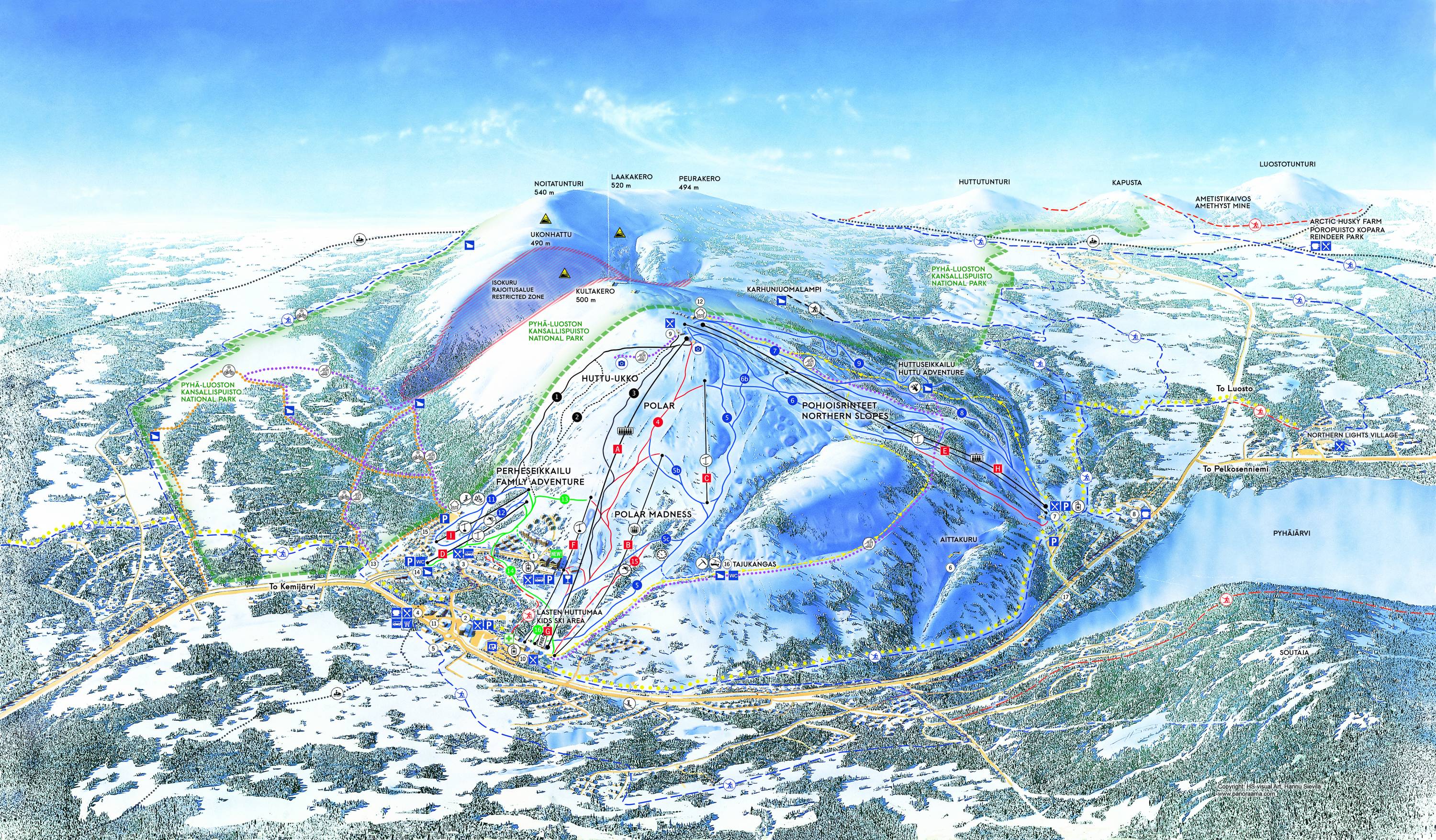 Het pisteplan geeft het skigebied Pyhä en Luosto zeer goed weer. Alle liften en pistes zijn ingetekend. Daarnaast worden veel extra informatie gegeven. Enkele hoogtegegevens zouden nog kunnen worden toegevoegd.